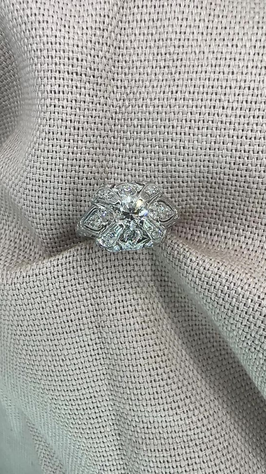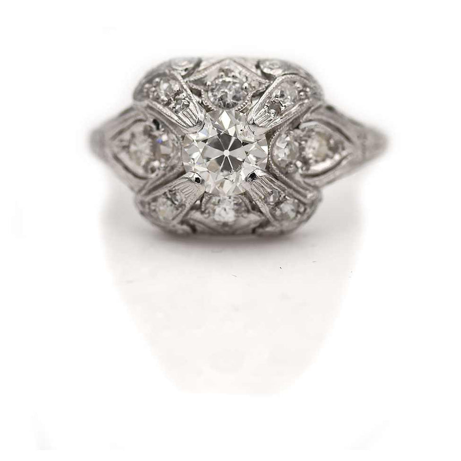 The Jaffe ring is an authentic vintage engagement ring from the Art Deco era circa, 1930s. This ring features a glittering .60 carat old European cut diamond of I color and VS2 clarity, surrounded by eight (8) old European and single cut diamond accents. Beautifully crafted in platinum, accentuated with spectacular open metalwork and delicate filigree and milgrain engravings. A timeless Art Deco jewel in very good condition. Magnifique!
