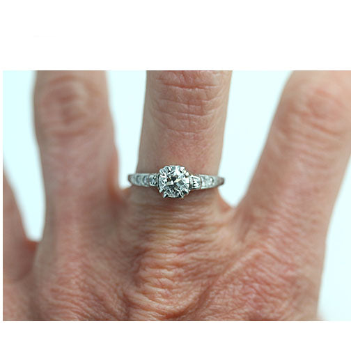The Lila ring is an authentic Art Deco engagement ring. The ring boasts an AGI certified .80 carat old European cut diamond of H color, SI1 clarity. The diamond is flanked by 8 single cut diamond accents. The diamond resides in a 4 double prong platinum setting. Crafted in the 1940s, accentuated with scrolling metal work and filigree engravings. A showstopping ring featuring a bright-white antique diamond and intricate detailing. In good condition.