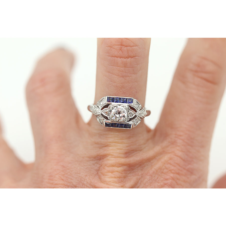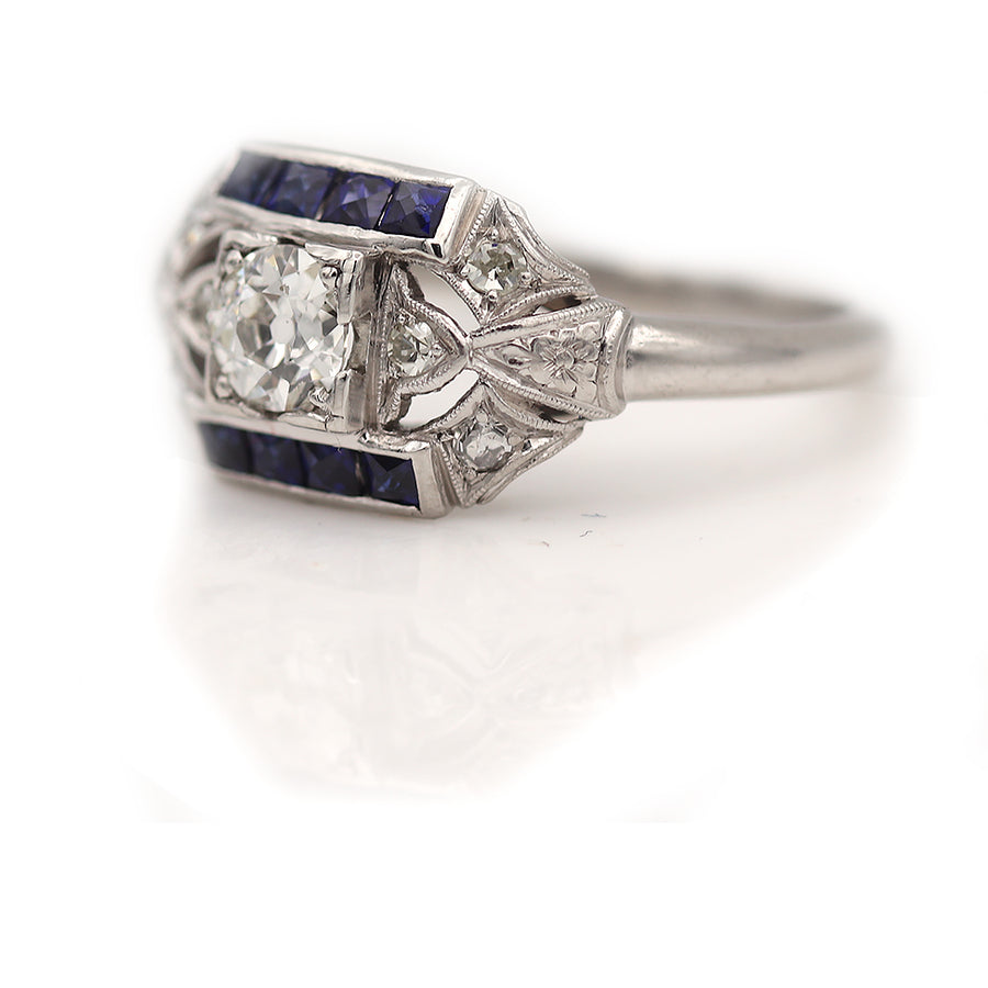 Art Deco 1.02 CTW Old Mine Cut Diamond Square Cut Sapphire Engagement Ring