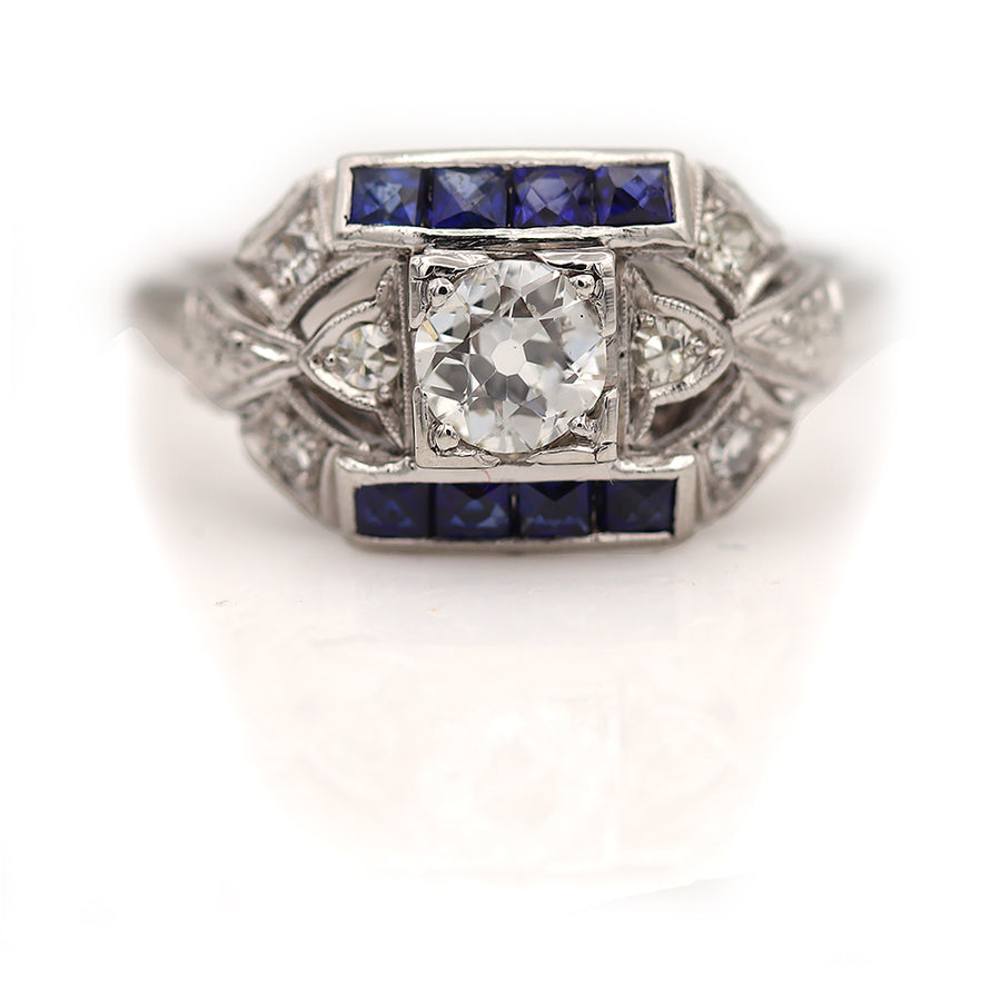 The Laine ring is an authentic vintage engagement ring from the Art Deco era, circa 1930s. This magnificent ring features a .50 carat old mine cut diamond (H color and VS1 clarity) residing within a geometric square frame, and is surrounded by six (6) single cut diamonds and eight (8) vintage synthetic square cut sapphires. Beautifully crafted in platinum, accentuated with open floral engravings, this is a beautifully timeless Art Deco piece. In very good condition and very hard to find.