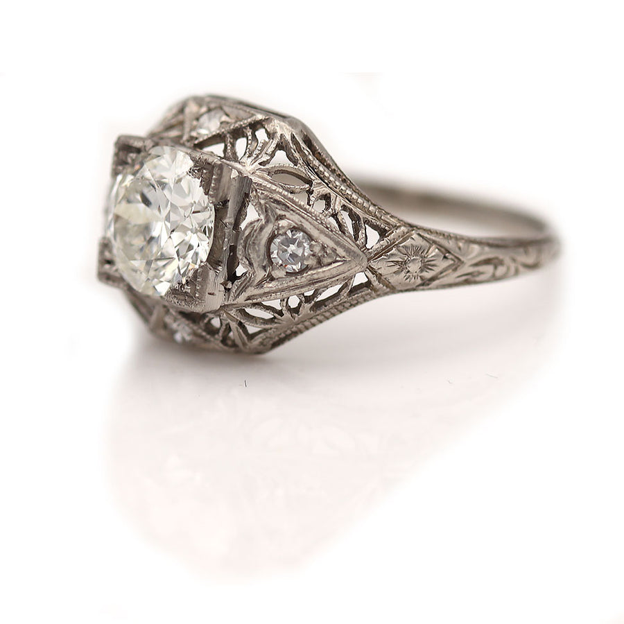 Art Deco 1.09 CTW Platinum Hand Engraved Vintage Diamond Engagement Ring