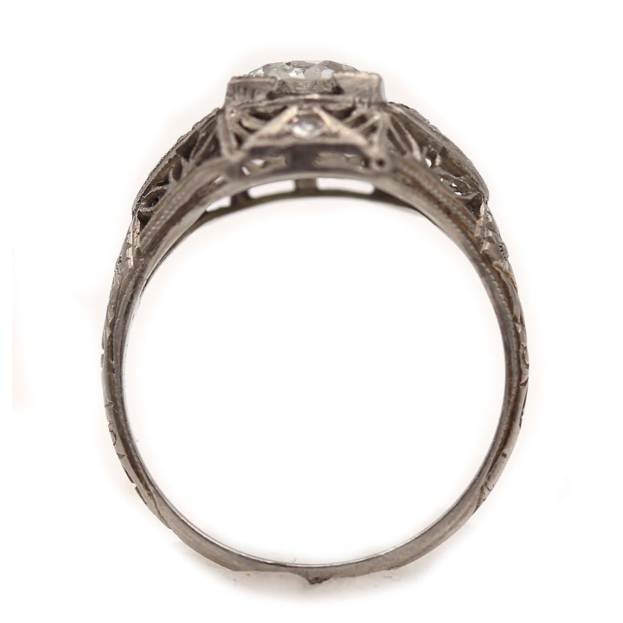The Amanda ring is an authentic vintage engagement ring from the Art Deco era circa 1920s. The ring showcases an AGI certified 1.01 carat old European cut of H color, SI2 clarity, residing in a geometric square frame. The diamond is surrounded by 4 single cut diamond accents. Crafted in platinum, hand embellished with open metal work and delicate filigree engravings. A stunning piece, with a magnificent vintage diamond. In pristine condition.