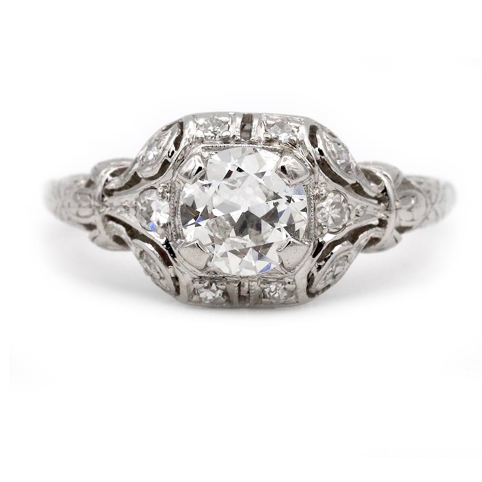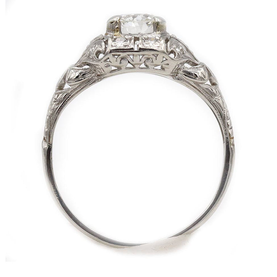 The Morgan R ring is an authentic vintage engagement ring from the Art Deco era circa 1930s. This ring features a .85 carat bezel set old European cut diamond of H color and VS2 clarity with 12 single cut diamond accents. Beautifully crafted in platinum and accentuated with open metal work and intricate milgrain and filigree engravings. A clean, crisp vintage treasure with beautiful detailing. In very good condition.