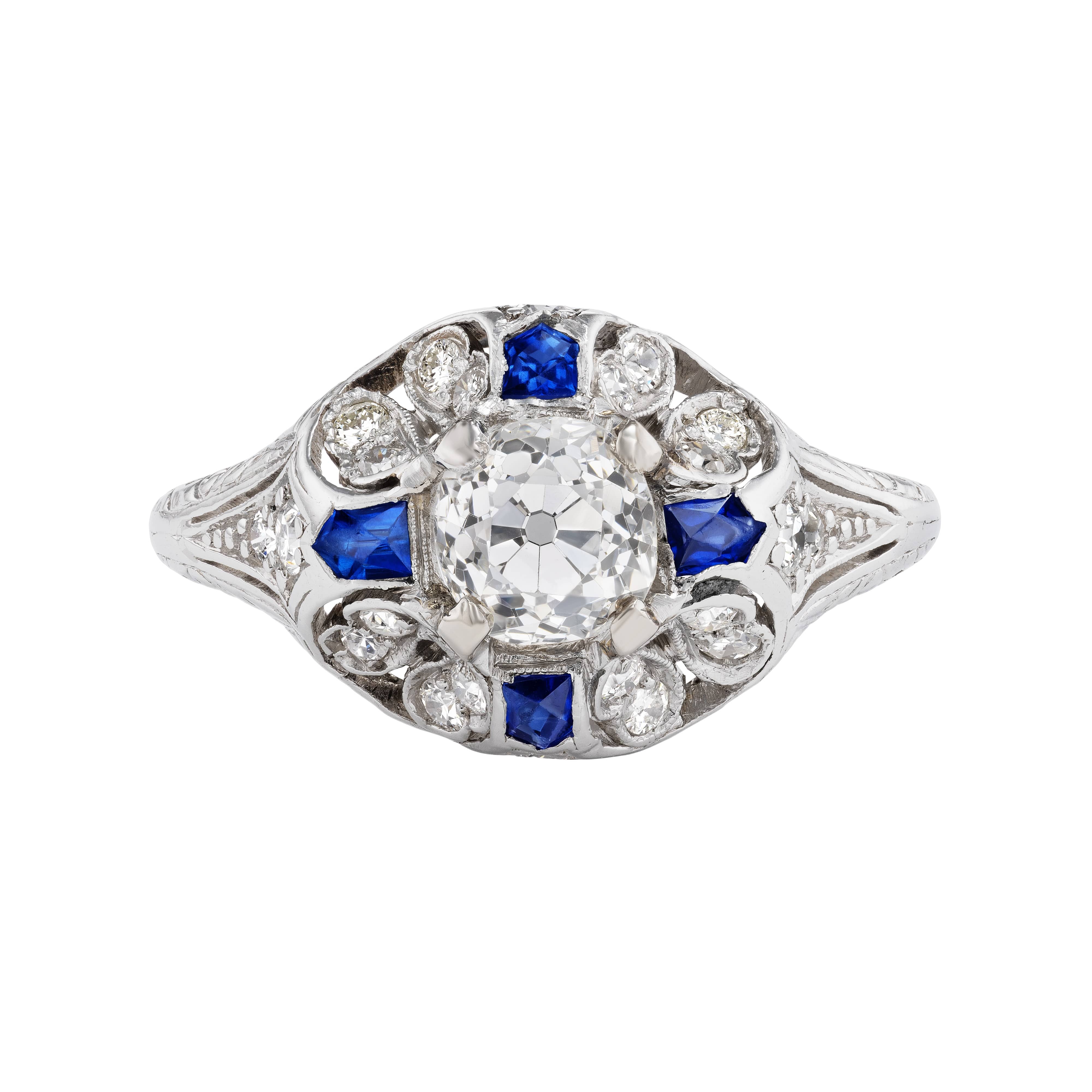 Art Deco 1.14 CTW Old Mine Cut Diamond Platinum Sapphire Engagement Ring