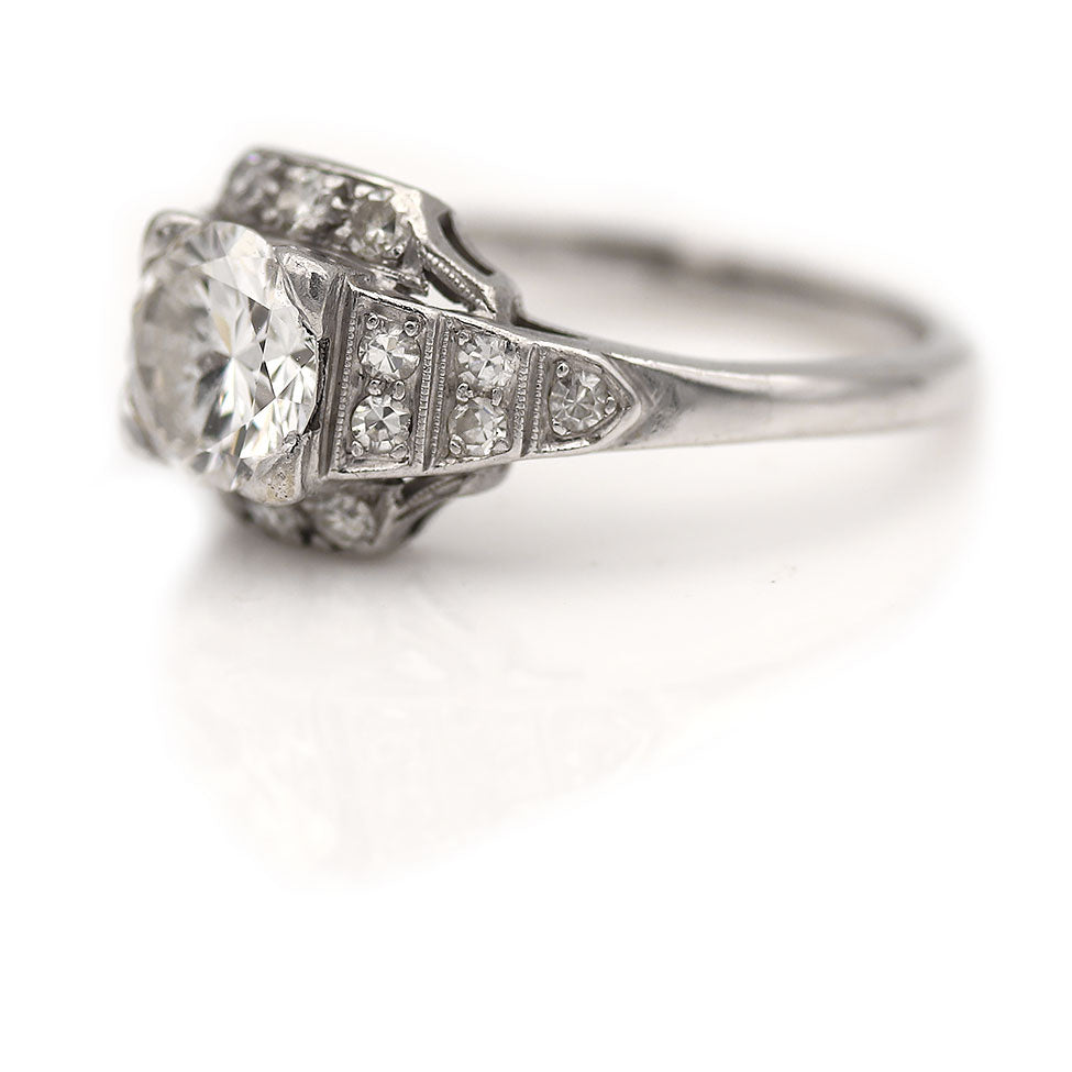 Art Deco 1.14 CTW Platinum Halo Antique Engagement Ring with Side Tiered Diamonds