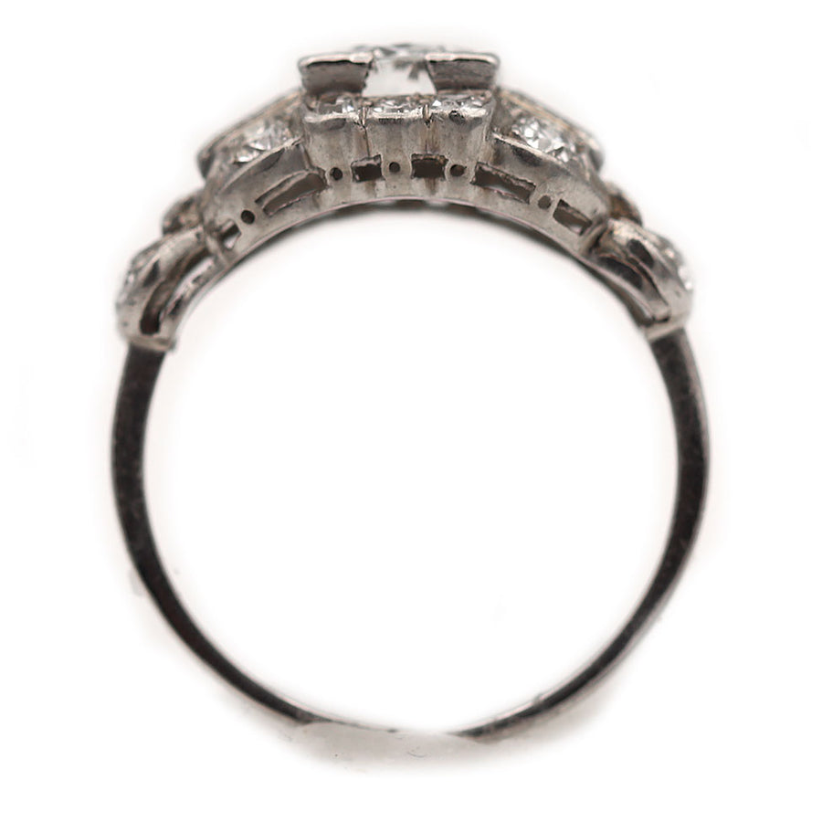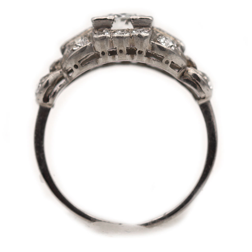 The Farit ring is an authentic vintage diamond engagement ring from the Art Deco era, circa 1930's. This ring boasts an AGI certified .75 carat old European cut diamond with F color and SI2 clarity, flanked by two (2) straight baguette diamonds and sixteen (16) old mine and single cut diamond accents. Beautifully crafted in platinum, and accentuated with delicate milgrain engravings, this is a classic vintage piece. In very good condition. They don't come any finer.