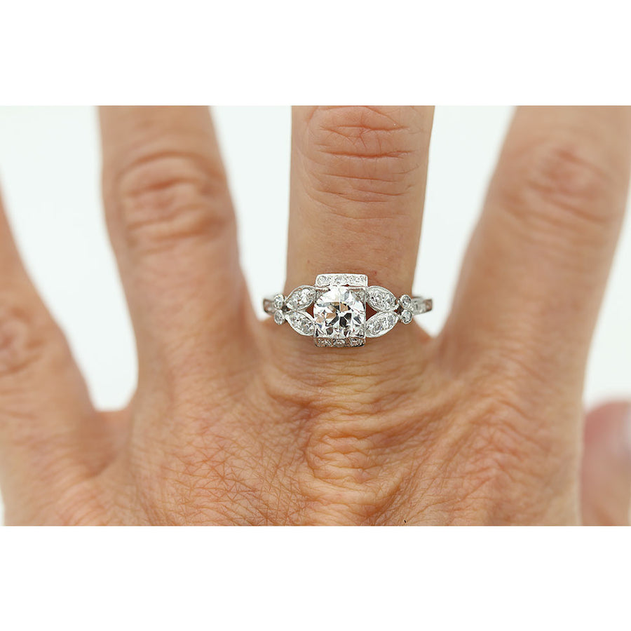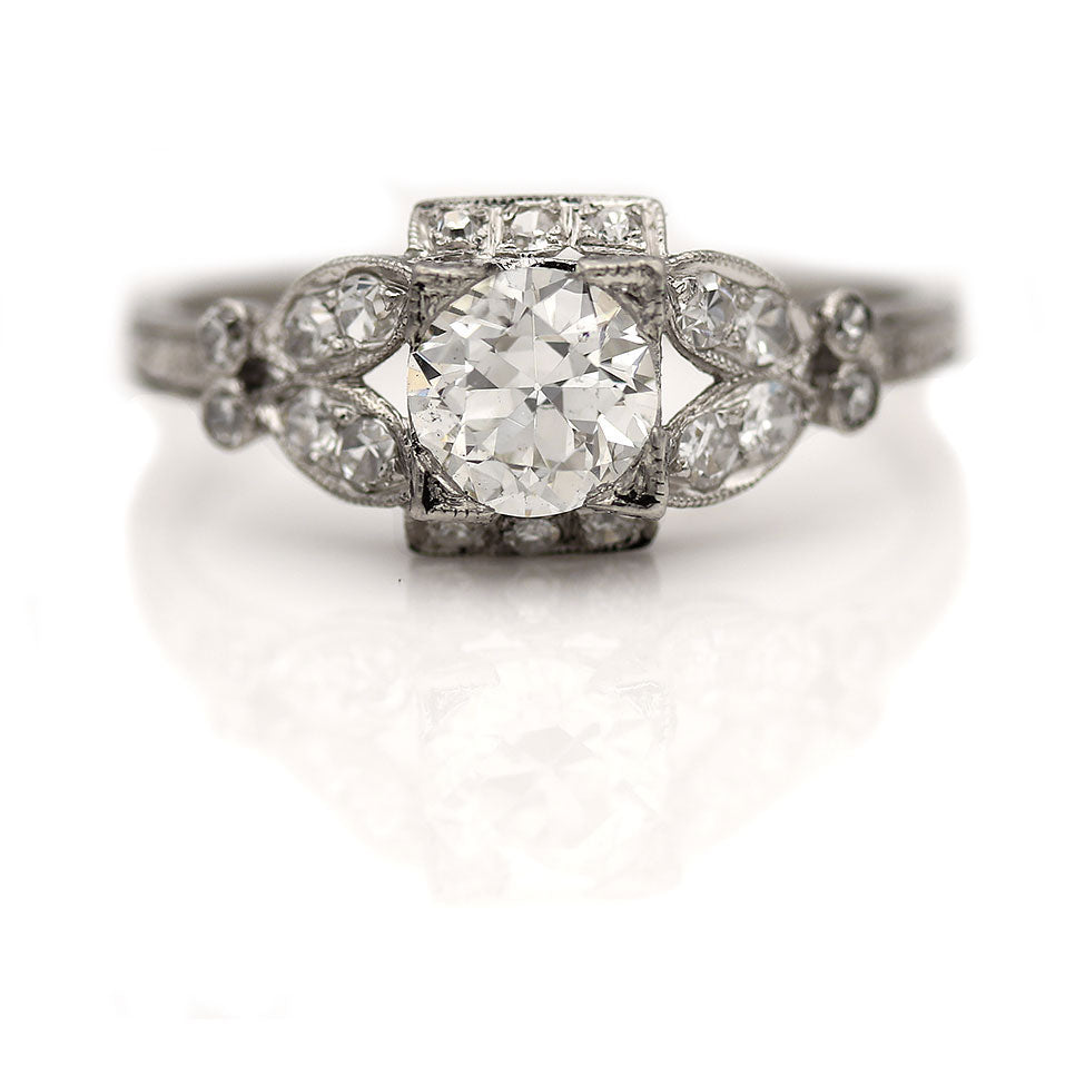 The Suzie Q ring is an authentic vintage diamond engagement ring from the Art Deco era, circa 1930s. This ring features an impressive .87 carat old European cut diamond with GIA report stating I color and VS2 clarity. This diamond resides within a square frame, flanked by a delicate split shank and eighteen (18) single cut diamond accents. Beautifully crafted in platinum, and accentuated with delicate milgrain and filigree engravings. A timeless vintage piece, in very good condition.