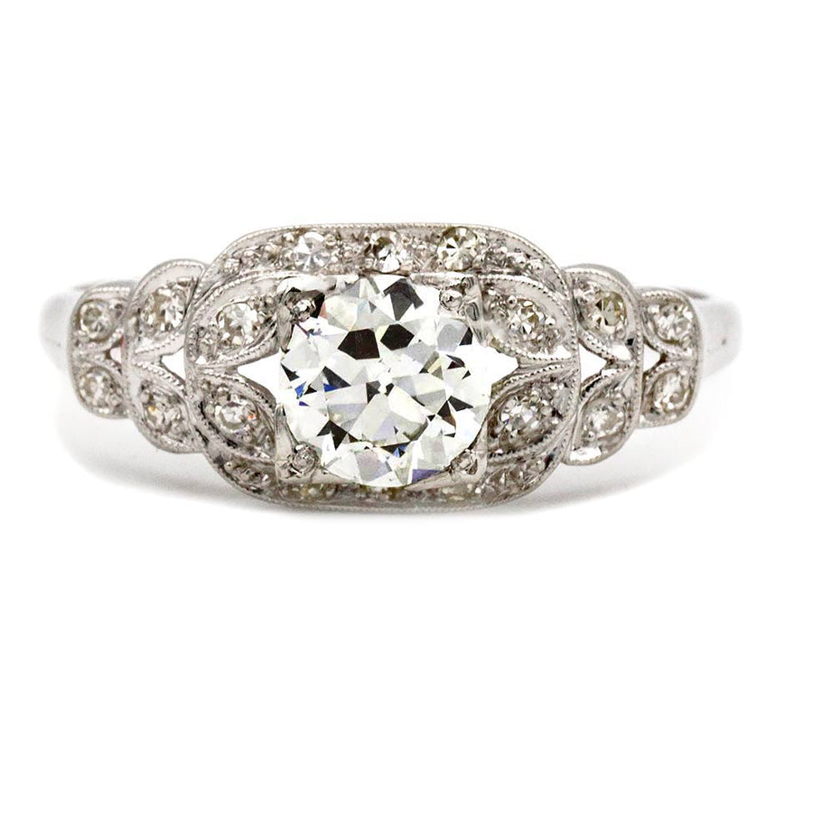 The Bonner ring is an original vintage engagement ring from the Art Deco era circa 1940's. This ring features a bright-white GIA certified 1.01 carat old European cut diamond of I color and SI1 clarity, surrounded by twelve (12) navette frame single cut diamonds and six (6) delicate single cut diamond accents. Crafted in platinum and accentuated with milgrain engravings, this ring is as sweet as can be. In very good condition.