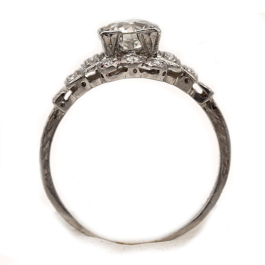 The Lexie ring is an authentic vintage diamond engagement ring from the Art Deco era circa 1920's. The ring features an AGI certified 1.01 old European cut diamond of J color, VS1 clarity. The diamond is surrounded by a delicate halo of 6 single cut and 14 side tiered single cut diamond accents. Hand crafted in platinum, accentuated with delicate milgrain and filigree engravings. The filigree continues to the base of the ring. A timeless and unique vintage ring, in very good condition.