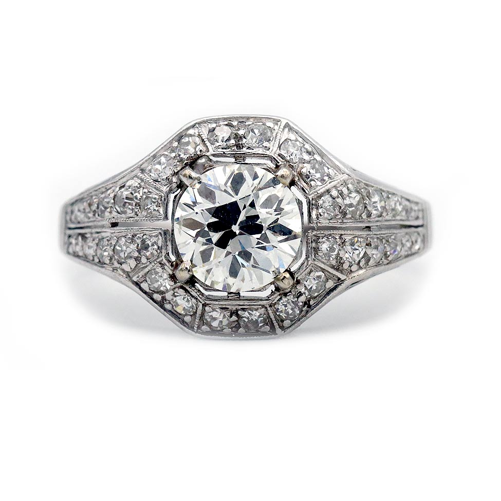 The Emi ring is an authentic vintage engagement ring from the Art Deco era circa 1930s. The ring features a 1.48 GIA certified old European cut diamond of K color, SI1 clarity, residing in a geometric octagonal frame. The diamond is surrounded by a delicate halo of 36 single cut diamond accents. Handcrafted in platinum, completed with open metal work and milgrain engravings. A showstopping vintage piece. In very good condition.