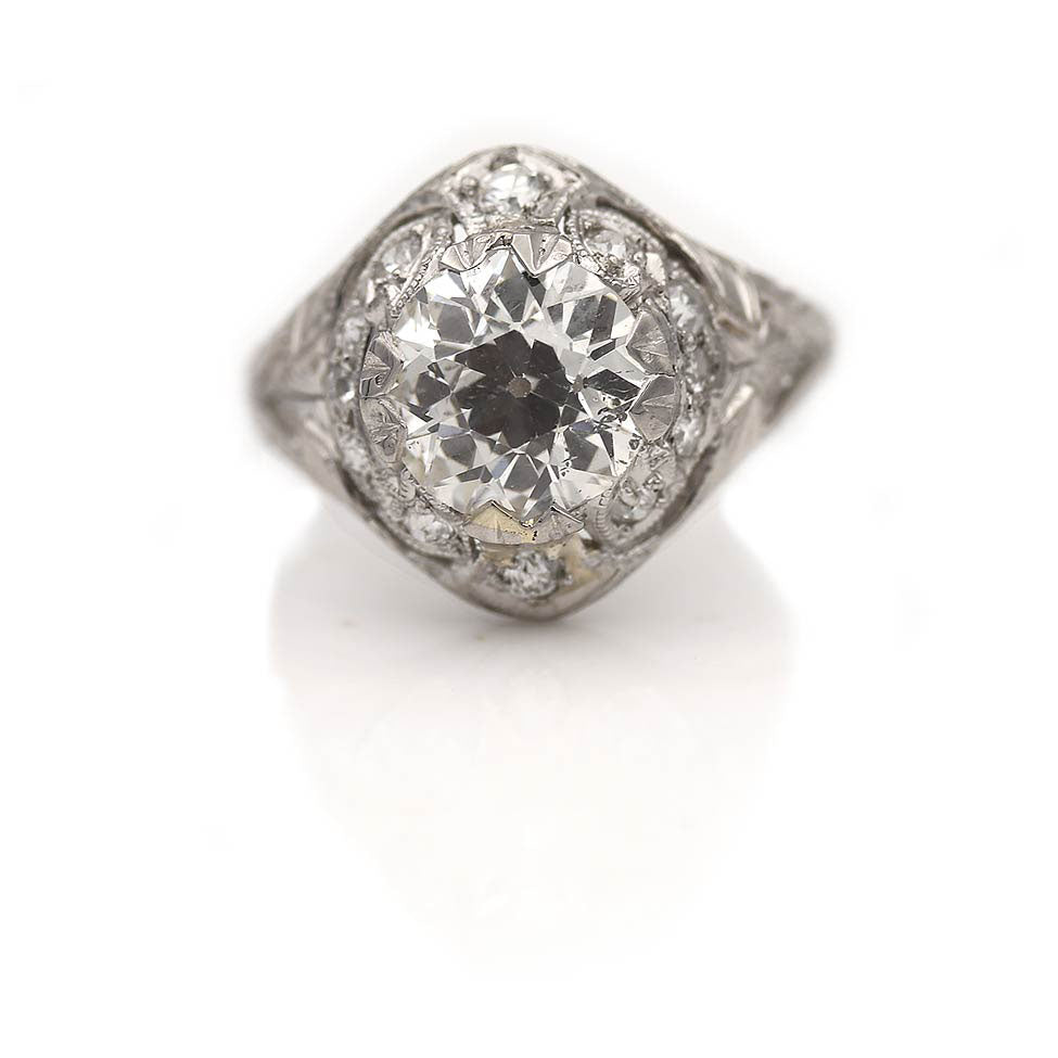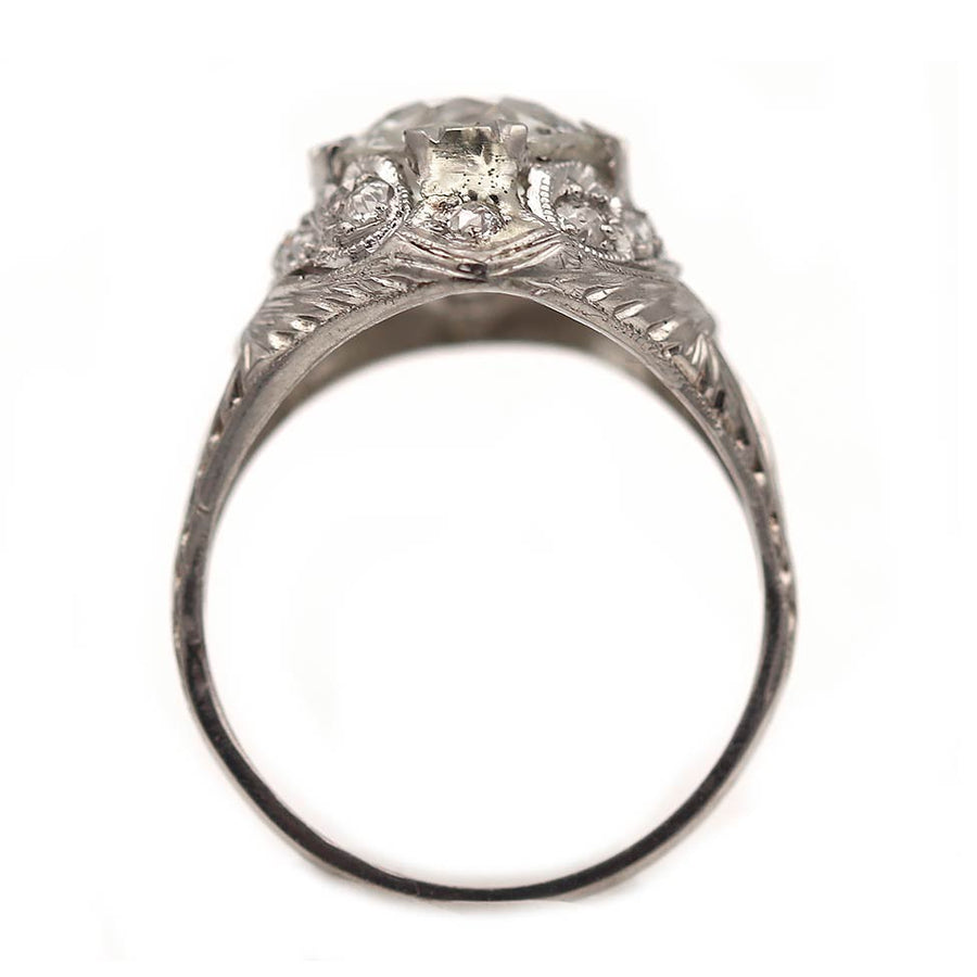 The Sirenna ring is a gorgeous, authentic vintage engagement ring from the Art Deco era circa 1930s. This ring showcases a dynamic GIA certified 2.11 carat old European cut diamond of I color and I1 clarity, surrounded by 12 single cut diamond accents. Beautifully crafted in platinum and accentuated with intricate milgrain and filigree engravings, this is a stunning vintage piece, in very good condition.