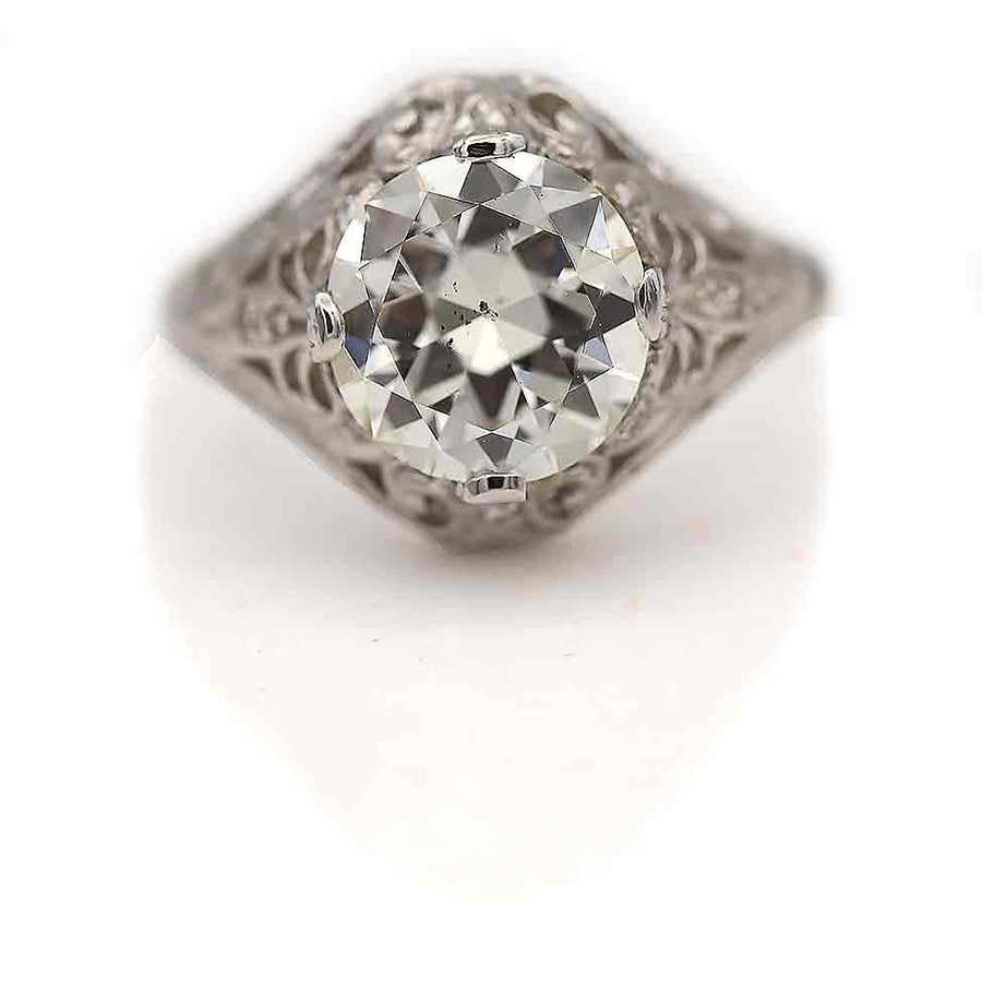 The Sweet L.D. ring is an authentic vintage diamond engagement ring from the Art Deco era, circa 1930s. This ring features a glittering 2.52 carat old European cut diamond of K color and SI2 clarity, flanked by ten (10) single cut diamond accents. Beautifully crafted in platinum, accentuated with open metal work and delicate filigree engravings. A timeless and stunning vintage piece, in good condition.