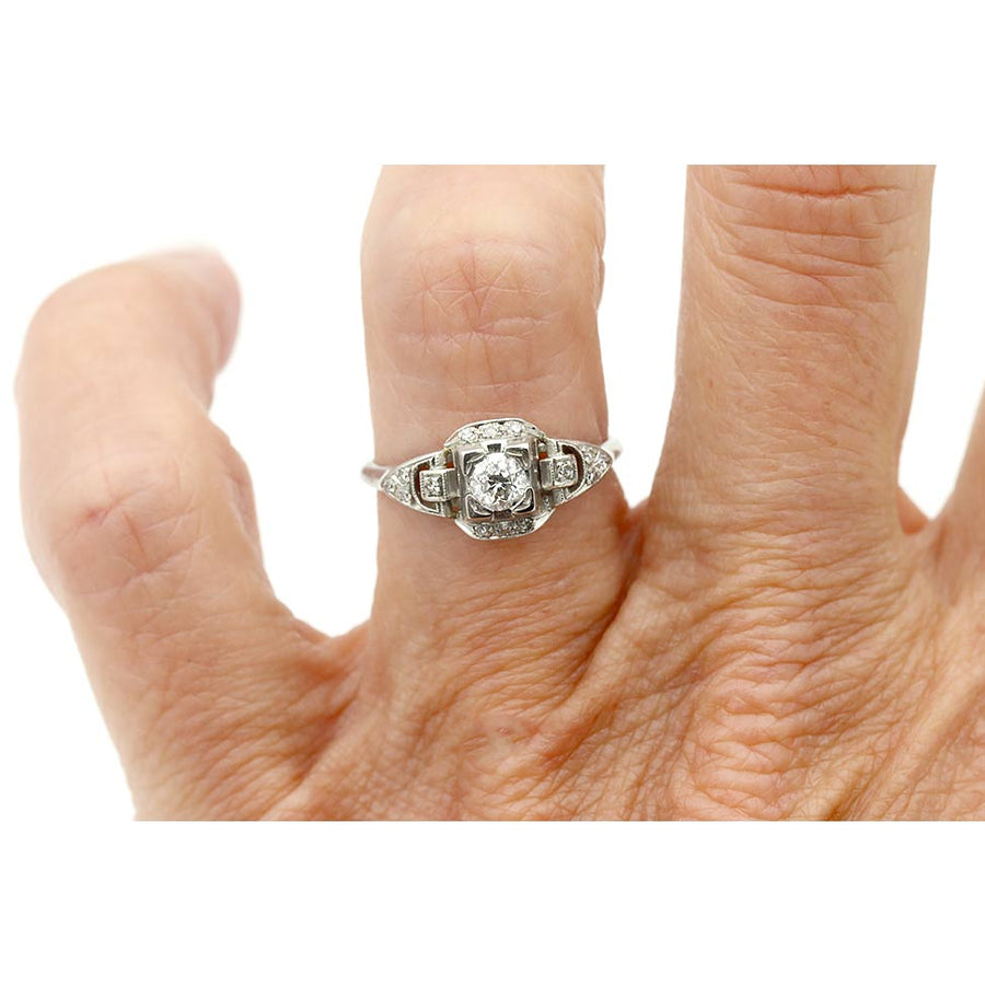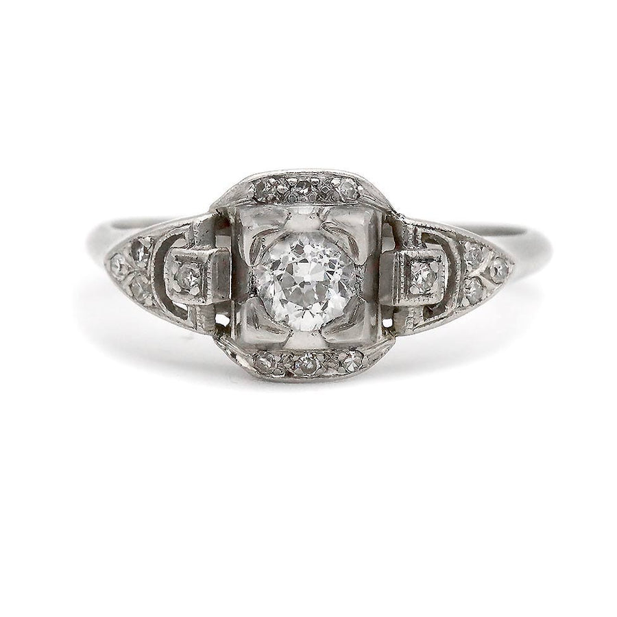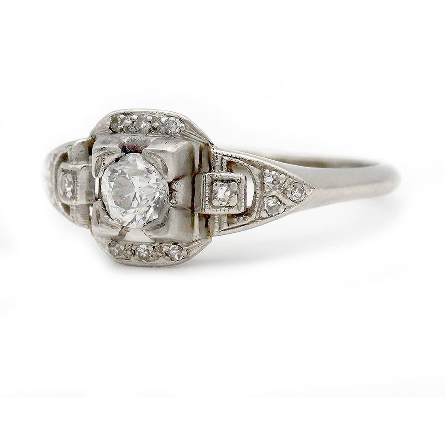 The Piazen ring is an authentic Art Deco engagement ring, circa 1930s, featuring a glittering .25 carat old mine cut diamond of F color and VS2 clarity, residing in a geometric square frame. This diamond is surrounded by fourteen (14) single cut diamond accents, all beautifully crafted in platinum and in good condition.