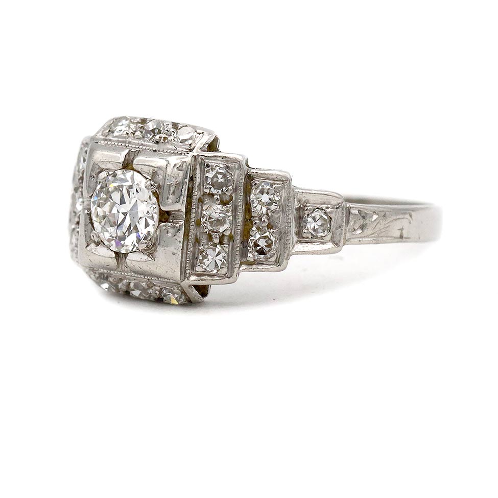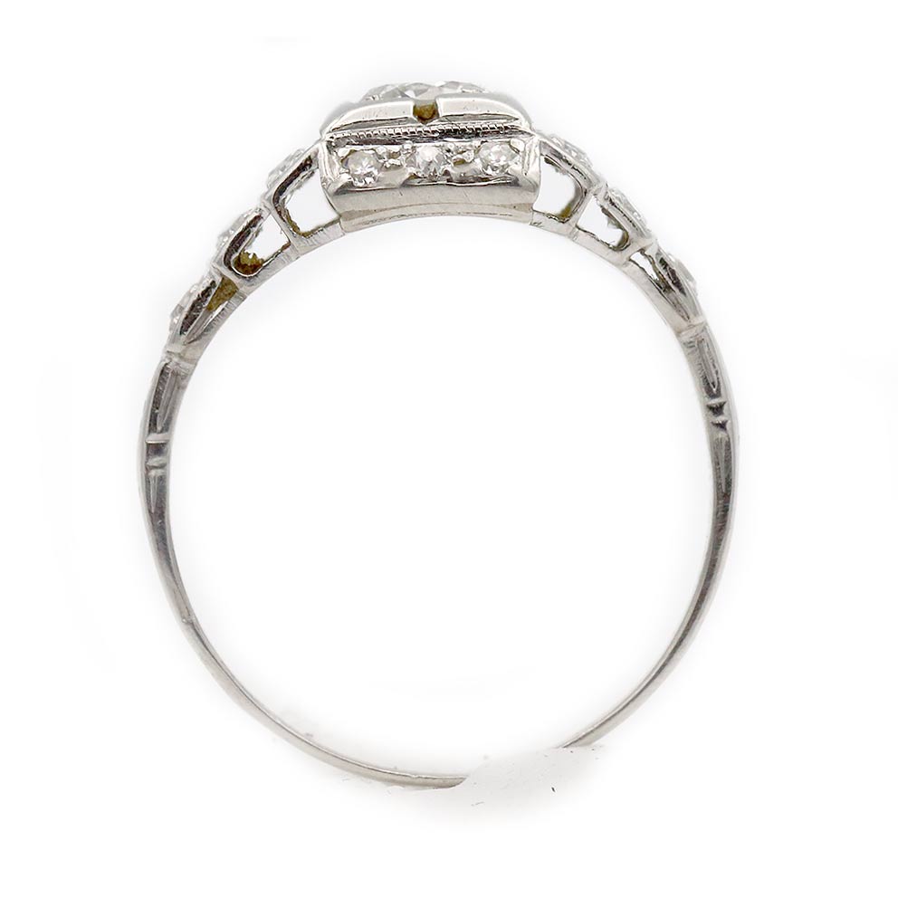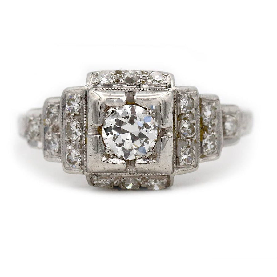 The Kinsley ring is an authentic vintage engagement ring from the Art Deco era circa 1930s. The ring features a glittering .35 carat old European cut diamond of G color, VS2 clarity, residing in a geometric square frame. The diamond is surrounded by a delicate halo of 6 single cut diamonds and 12 side tiered single cut diamond accents. Crafted in gleaming platinum, accentuated with delicate milgrain engravings. A consummate Art Deco jewel. In very good condition.