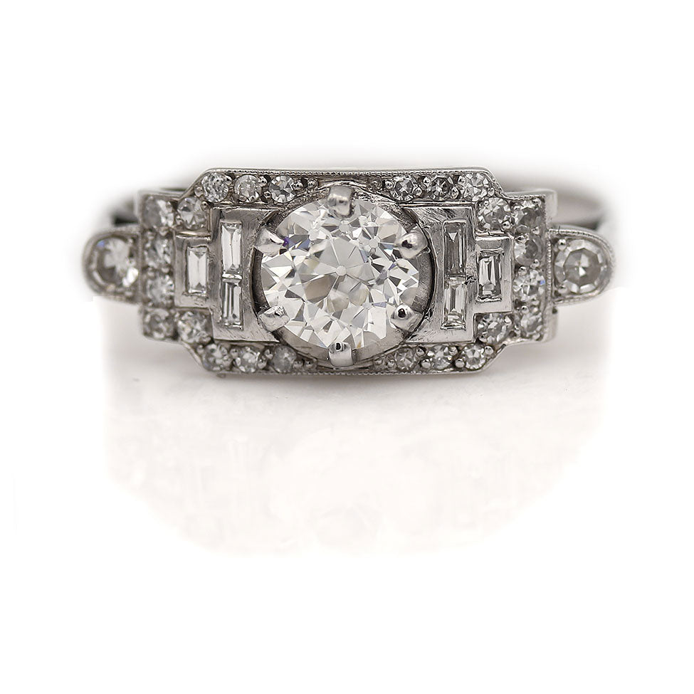 Art Deco .90 CTW Old European Cut Baguette Diamond Vintage Engagement Ring