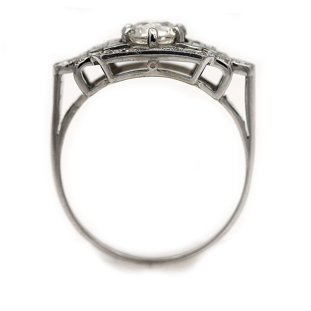 The Donatella ring is an authentic vintage engagement ring from the Art Deco era circa 1940's. The ring showcases a dazzling .65 carat old European cut diamond of H color, VS2 clarity. The diamond is flanked by 6 baguette diamonds and 24 single cut diamond accents. Handcrafted in platinum, adorned with delicate milgrain engravings and an open work gallery. A consummate Art Deco jewel, in very good condition.