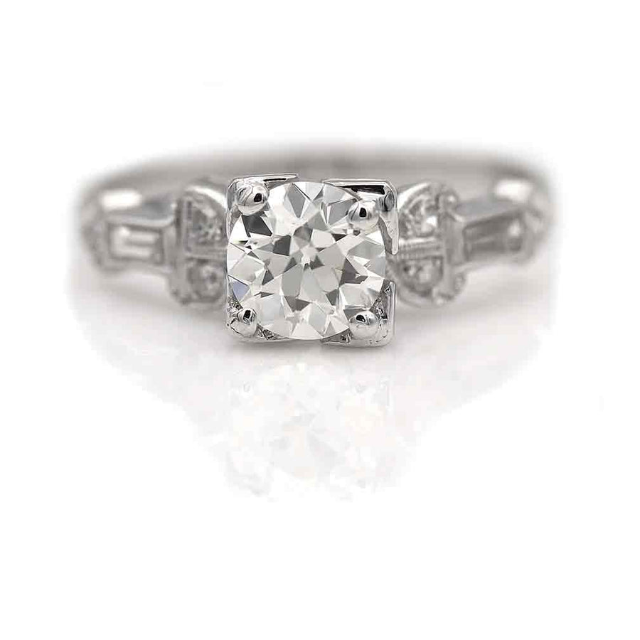 The Dianna R ring is an authentic vintage engagement ring from the Art Deco era, circa 1930's. This ring features a glittering .73 carat GIA old European cut diamond of J color and SI1 clarity, residing within a geometric square frame and flanked by six (6) single cut diamond accents and two (2) straight baguette diamond accents. Beautifully crafted in platinum, and accentuated with delicate milgrain engravings. Magnifique. In very good condition.