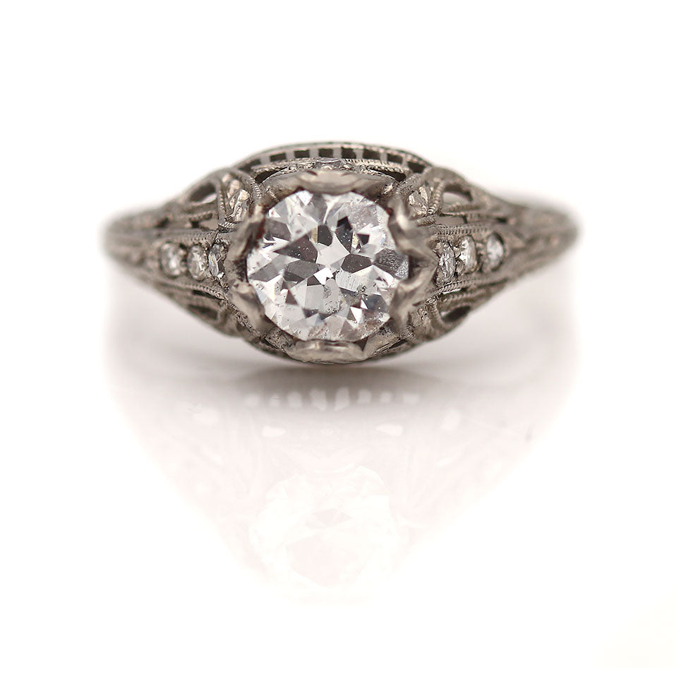 The Veronique ring is an authentic vintage engagement ring from the Art Deco era circa 1930's. The ring showcases a .86 carat GIA certified old European cut diamond of E color, SI2 clarity. The diamond is flanked by 8 shoulder set single cut diamond accents. Handcrafted in platinum, accentuated with swirls of open metal work and intricate filigree engravings. A magnificent vintage piece. In pristine condition.