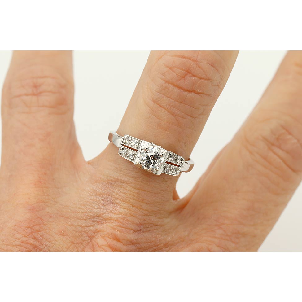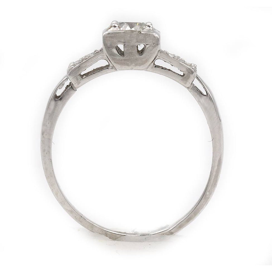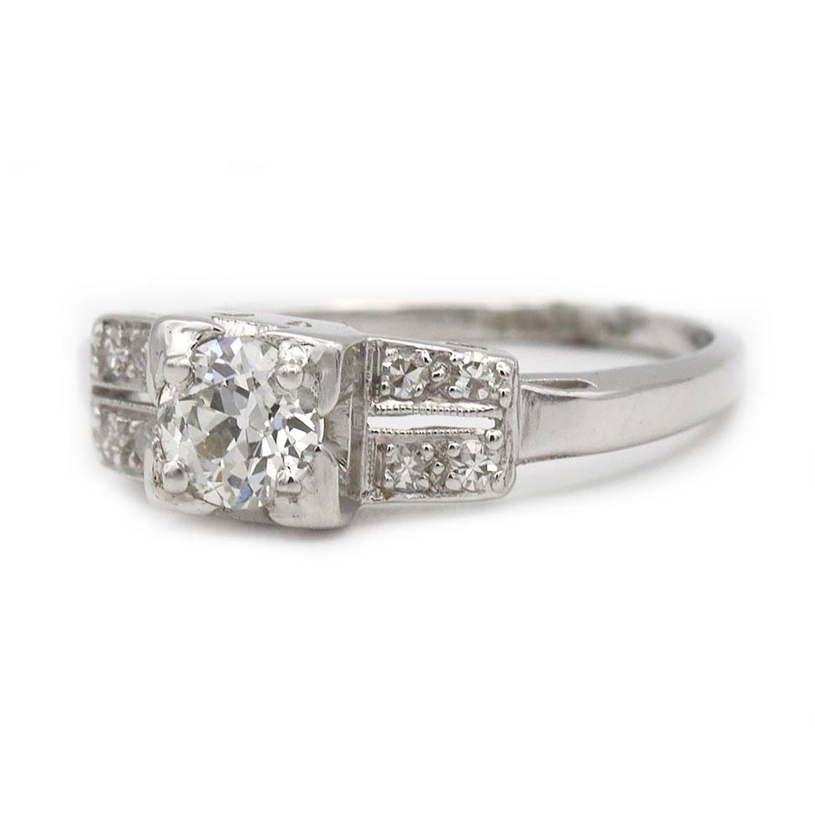 The Sher ring is an authentic vintage diamond engagement ring from the Art Deco era, dating to the 1940s. It features a bright white .50 carat old European cut diamond, graded F color and SI2 clarity, set within a refined square frame. A delicate split shank is accented by eight single-cut diamonds along the shoulders. Crafted in platinum and finished with fine milgrain engraving, this is a timeless Art Deco engagement ring offered in good vintage condition.