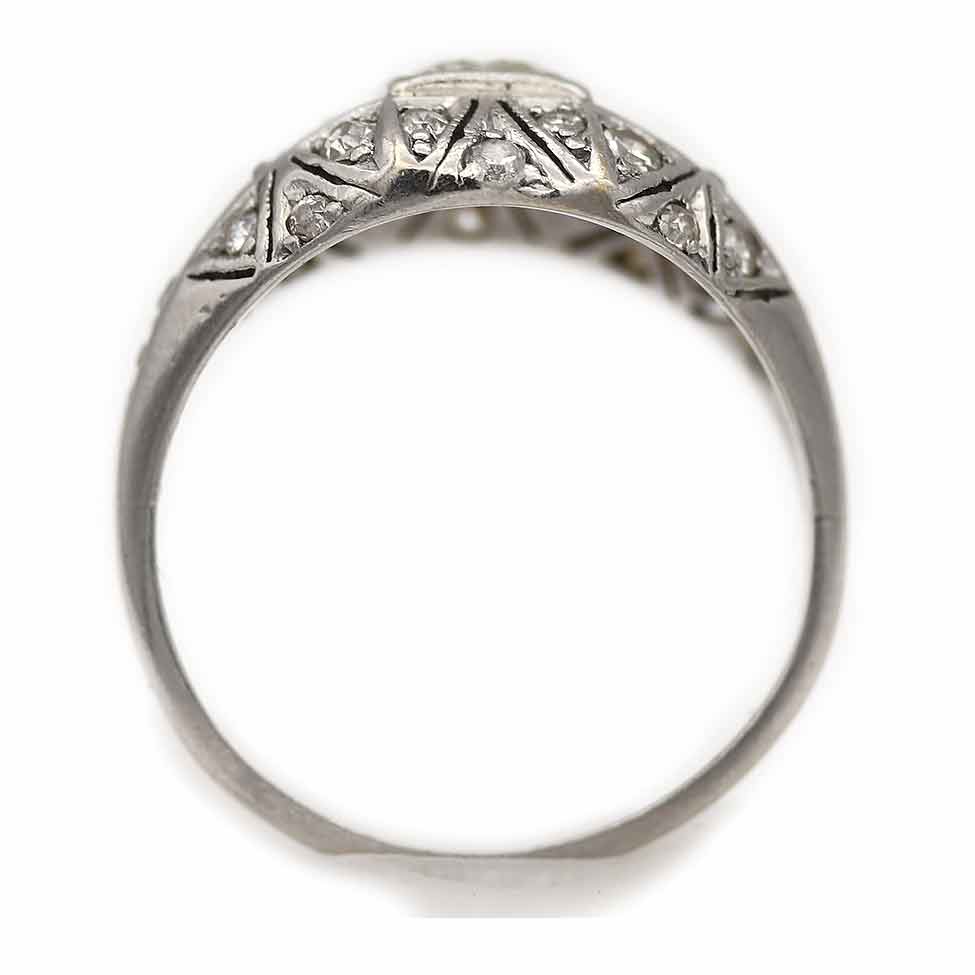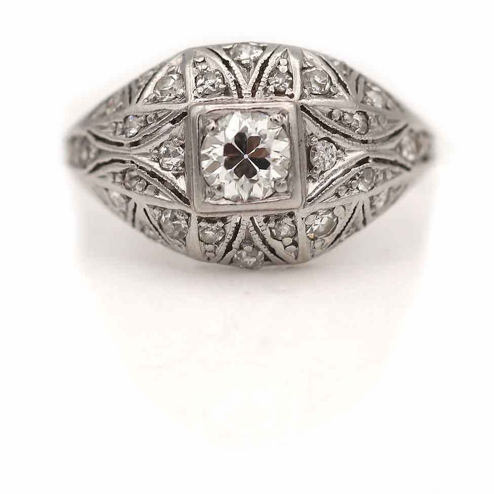 The Simon ring is an authentic vintage engagement ring from the Edwardian era, circa 1920s. This ring features a .30 carat old European cut diamond of I color and VS2 clarity residing in a geometric square frame, surrounded by thirty two (32) rose and single cut diamond accents. Beautifully crafted in platinum, and accentuated with delicate milgrain engravings, this is a lovely Edwardian ring, in good condition.