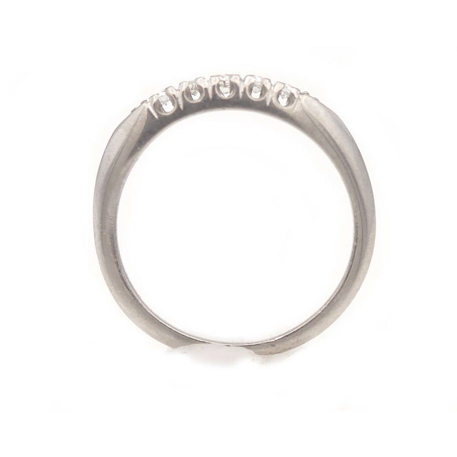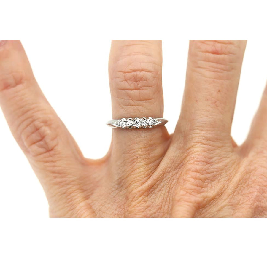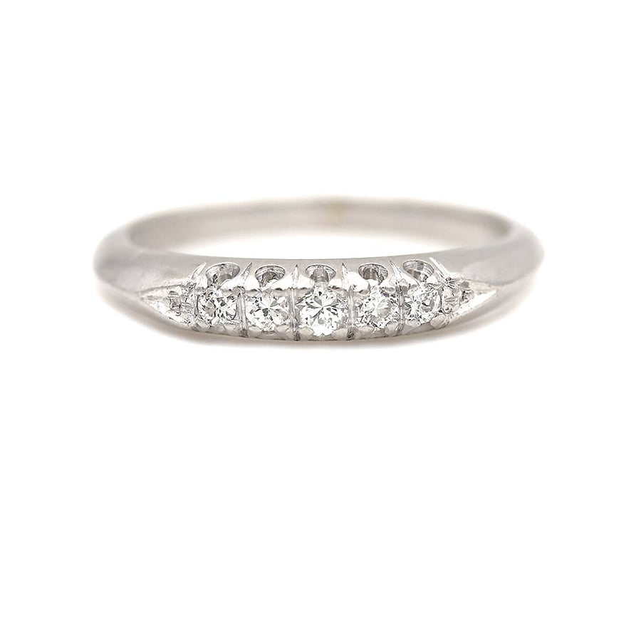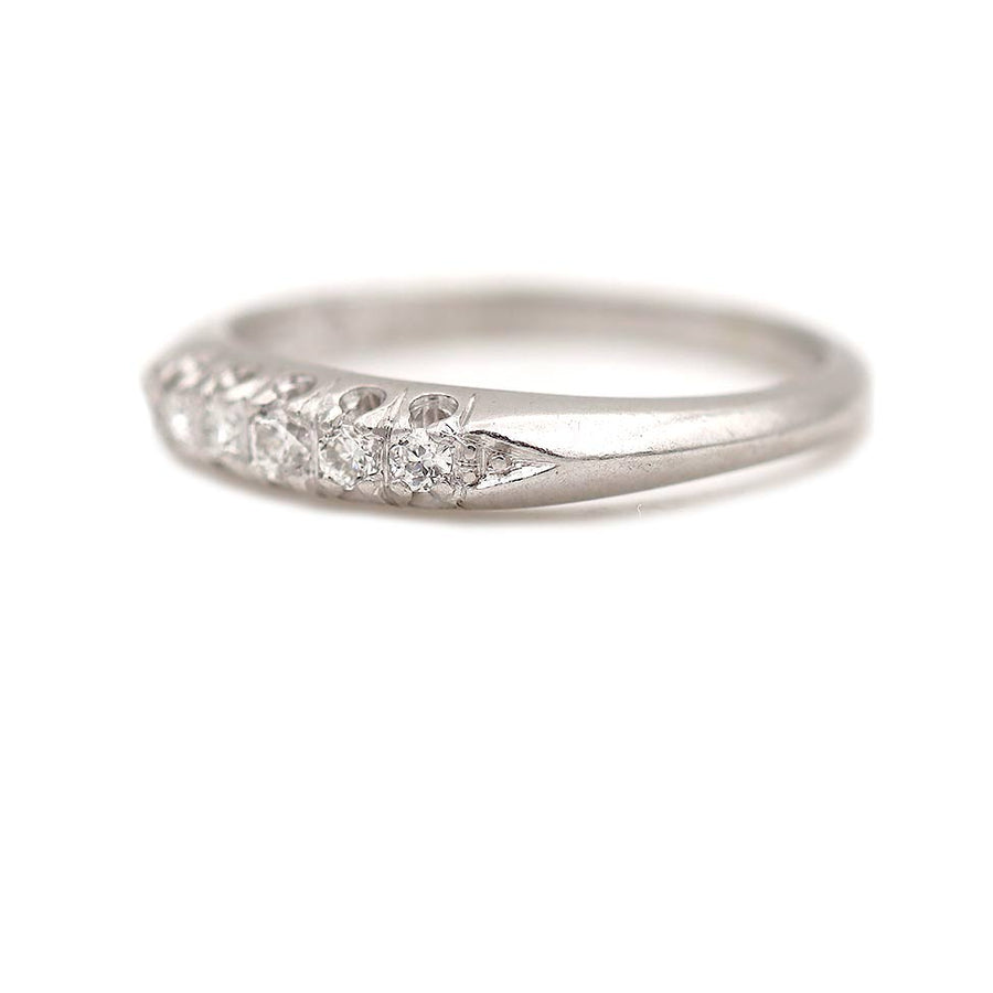 Robinne is an enchanting and authentic antique wedding band featuring 5 glittering prong set old mine cut diamonds, weighing .15 carat with F color and SI1 clarity. Beautifully crafted in the 1950's in platinum, this is the perfect band to stack with other vintage wedding bands or to compliment your vintage engagement ring. The band measures 3.25 wide tapering to 2.8 and 1.55 at the bottom. Elegant and classic. In very good condition.