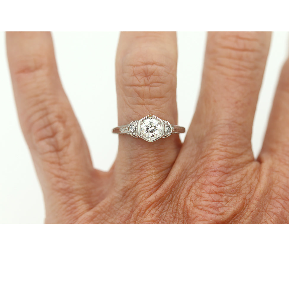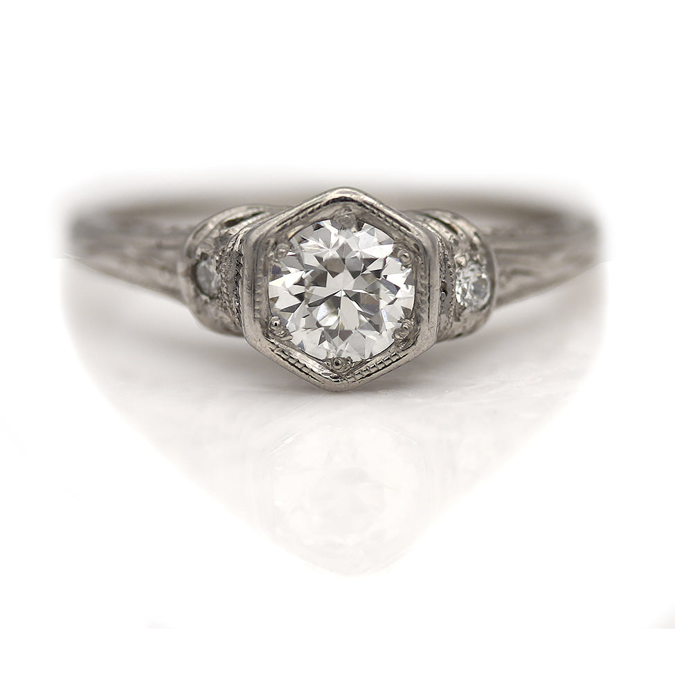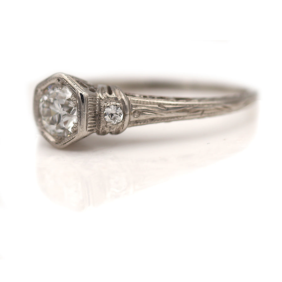 The River ring is an authentic vintage diamond engagement ring from the Art Deco era, circa 1930s. This ring showcases a .40 carat old European cut diamond of H color and VS2 clarity, residing within a geometric hexagonal frame and flanked by two (2) old mine cut diamond accents. Beautifully crafted in platinum, and accentuated with delicate filigree engravings and open metal work. A timeless vintage Art Deco piece, in very good condition.