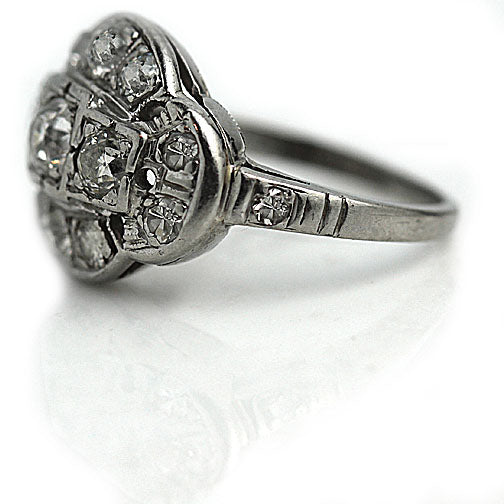 The Imelda ring is an authentic vintage cocktail ring, circa 1940s. The ring features a centered .30 carat bright white old European cut diamond of H color, SI1 clarity, gracefully placed within a square frame. The diamond is flanked by 2 European cut diamond accents and surrounded by 12 old European cut diamonds accents, weighing approximately 1.10 carat. Crafted in gleaming platinum. A chic, bold statement ring, that is just so perfect to wear on your left or right hand. In very good condition.
