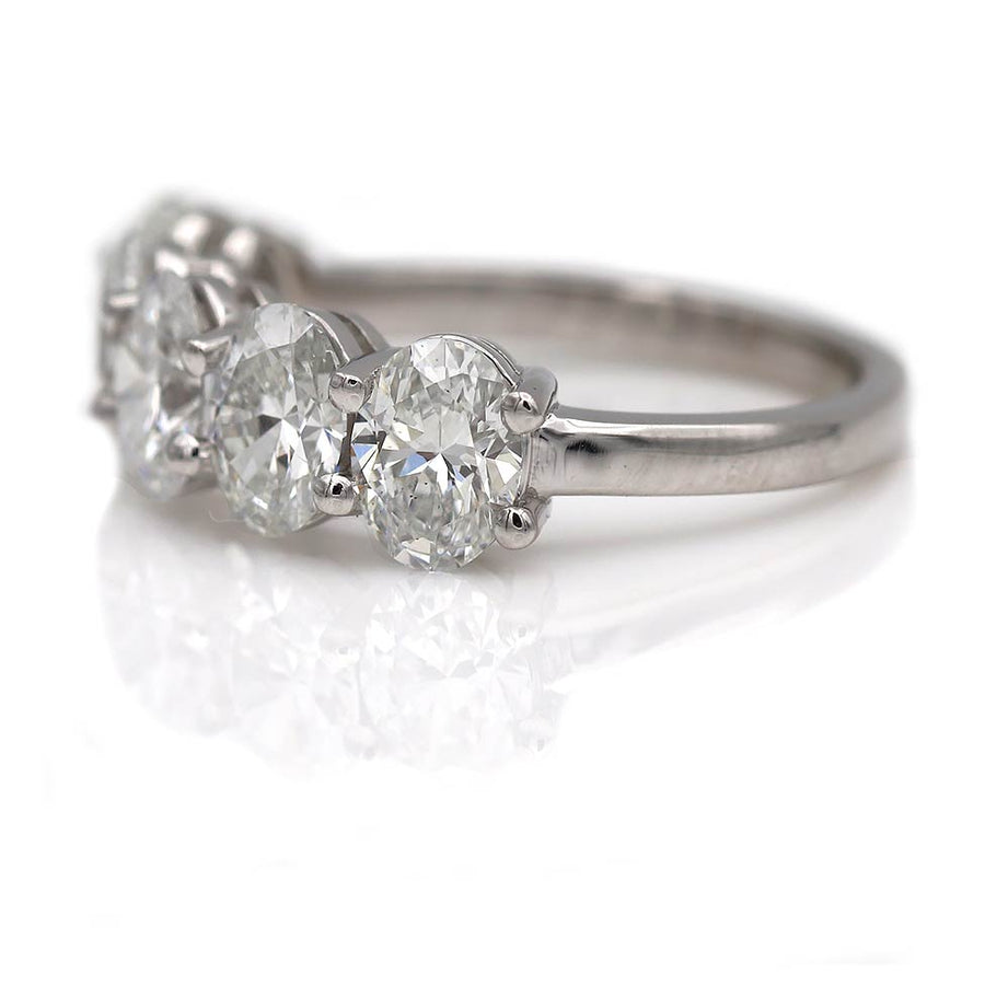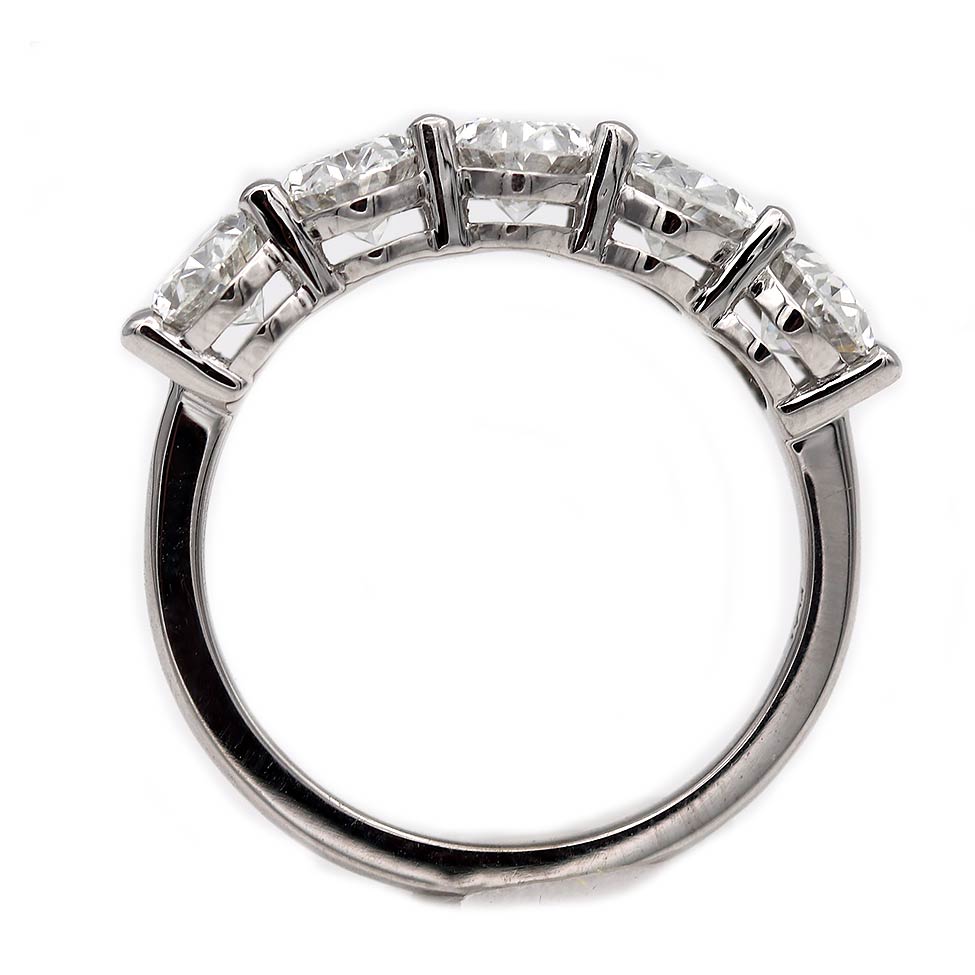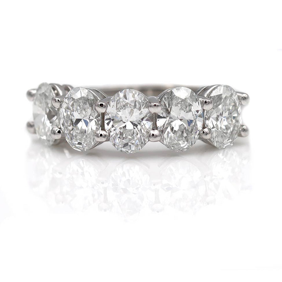 The Luciana wedding ring is a vintage inspired VDR.com made wedding ring using 5 authentic oval cut diamonds circa 1980's. This magnificent and stunning oval cut band features five bright-white vintage oval cut diamonds weighing exactly 2.51 carat (.50, .50, .50 , .50, .51), accompanied with 5 GIA reports stating F and G color SI1 clarity. Superbly hand crafted in recycled platinum. A showstopping wedding ring! This piece is based on an authentic vintage oval band ring we once owned. Made with love in NYC.
