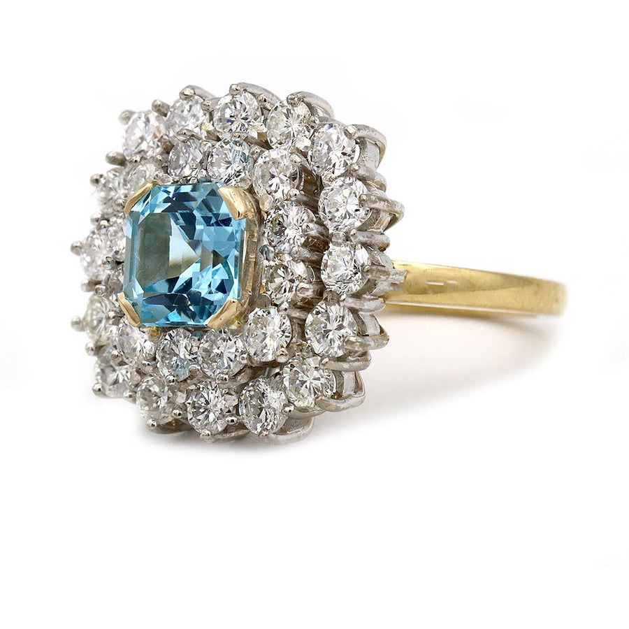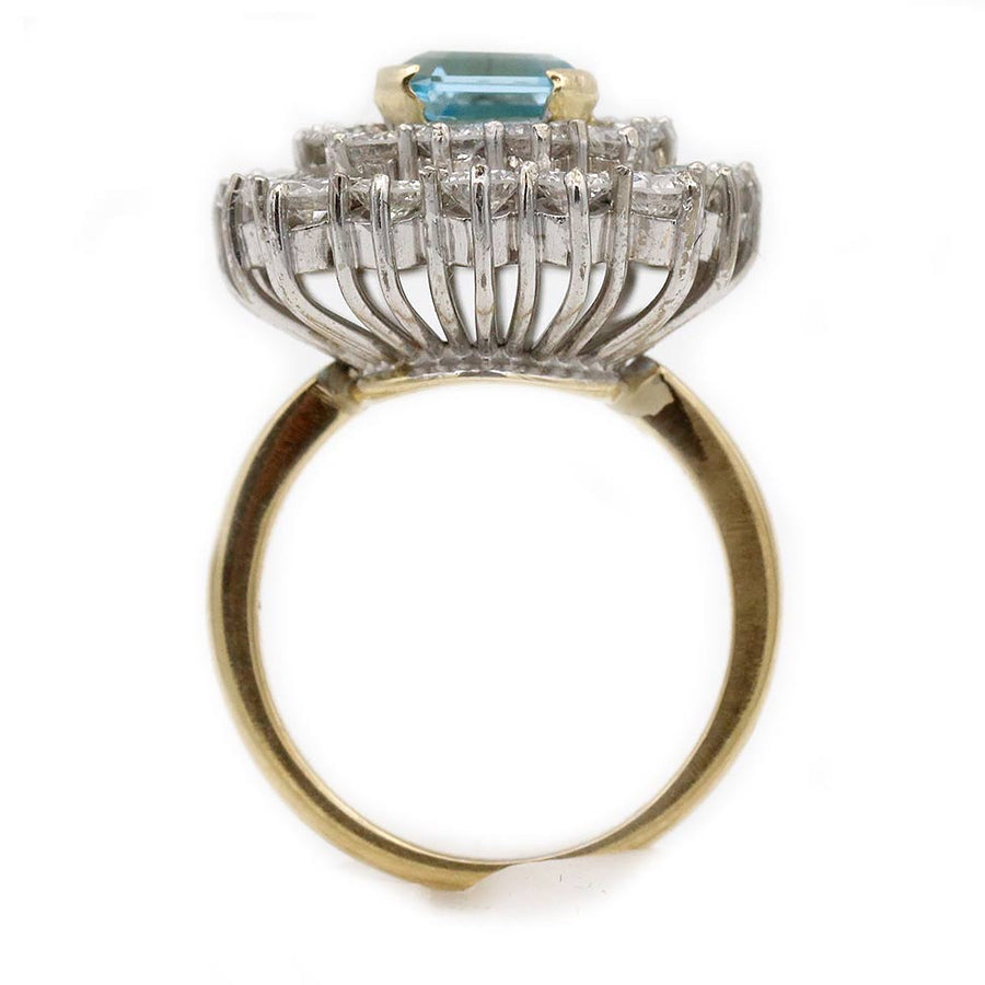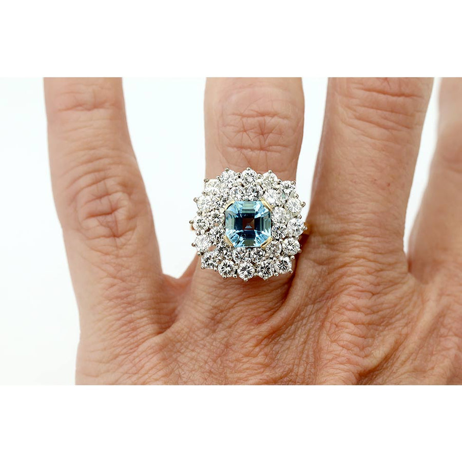 The Rhomberg ring is an authentic vintage emerald cocktail ring, circa 1970's. This ring features a natural 1.50 carat square cut aquamarine surrounded by a delicate halo of twenty eight (28) round diamonds weighing approximately 2.50 ctw. Crafted in a platinum and 18 karat yellow gold setting, this is a show stopping ring. Classic, always timeless, and in very good condition.