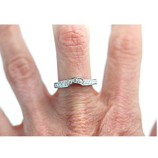 Nilla is a classic estate Art Deco style platinum contoured wedding band featuring 34 bright-white bead set round-cut diamonds weighing .58 carat (F color and VS2 clarity). A perfect complement with your vintage engagement ring or stacked with your favorite bands. In excellent condition. In excellent condition.