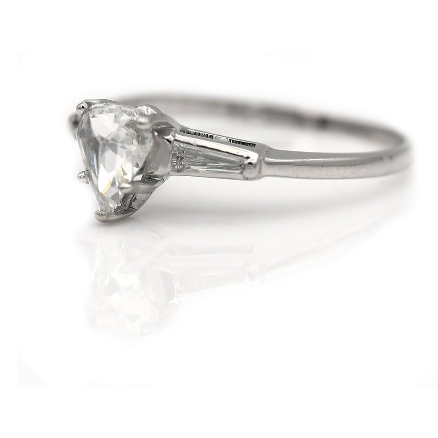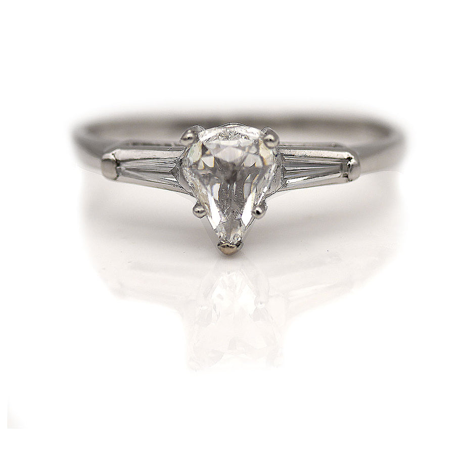 The Mattie R ring is an authentic vintage diamond engagement ring circa 1960's. This Teardrop diamond ring showcases an authentically vintage GIA certified diamond .63 carat pear-rose cut diamond of H color, SI1 clarity (circa 1920's). The diamond is flanked by 2 tapered baguette accents. Beautifully crafted in platinum. Classic, elegant and in pristine condition.