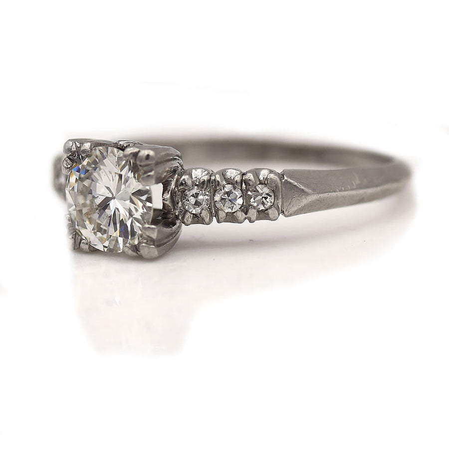 The Rosie ring is an authentic antique diamond engagement ring from the Art Deco era circa 1950's. The ring features an AGI certified .75 carat transitional cut diamond of I color, SI2 clarity, residing within trefoil prongs. The diamond is flanked by 6 transitional cut diamond accents. Beautifully crafted in platinum. A consummate 1950's engagement ring with the perfect amount of patina. In very good condition.