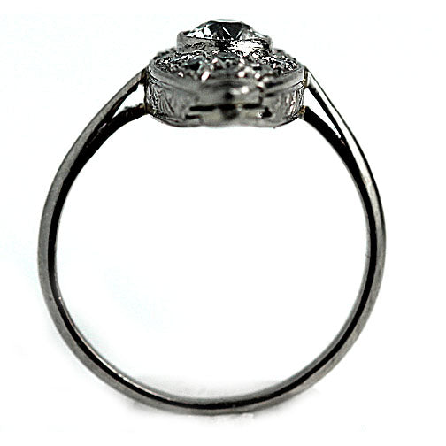 The Amelie ring is an authentic antique diamond dinner ring from the the Art Deco era circa 1940s. The ring showcases a bright-white .50 carat bezel set old European cut diamond of G color, VS2 clarity. The diamond is surrounded by 14 glittering old European cut diamond accents. Handcrafted in platinum, accentuated with delicate milgrain engravings and filigree around the base of the ring. A slender and elegant ring. Perfect to wear on either hand. In excellent condition.