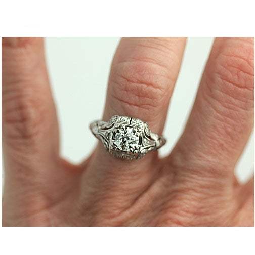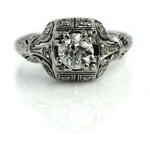 The Kimmie ring is an authentic Art Deco engagement ring circa 1930's. The ring features a dazzling AGI certified .70 carat old mine cut diamond of I color, VS2 clarity, residing in a geometric square frame. The diamond is surrounded by 10 single cut diamond accents. Beautifully crafted in platinum, accentuated with swirls of metal work and filigree engravings. A rare, one of a kind vintage ring. In pristine condition. They don't come any finer.