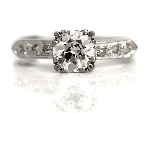 The Emmi ring is an authentic vintage engagement ring circa 1950's. The ring features a GIA certified 1.05 carat old European cut diamond of K color, I1 clarity, residing in trefoil prongs. The diamond is flanked by 6 single cut diamond accents. Beautifully crafted in platinum, accentuated with delicate milgrain engravings. A timeless ring, in very good condition.