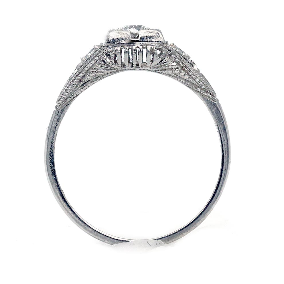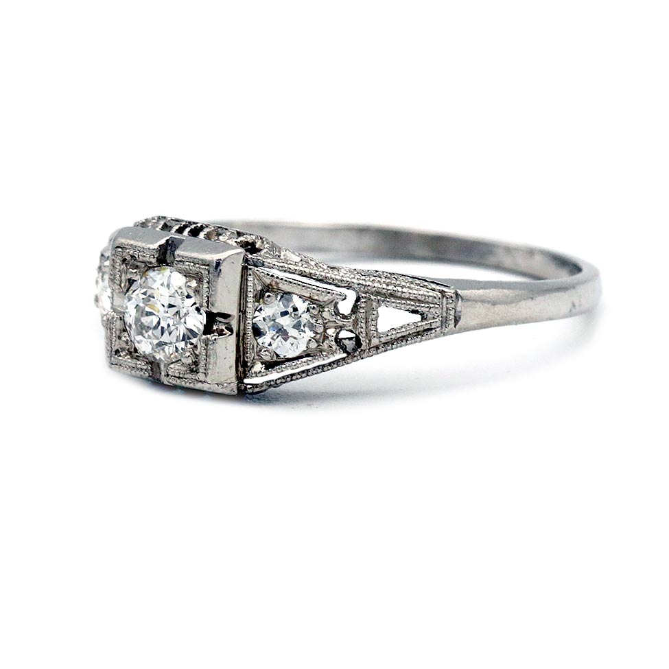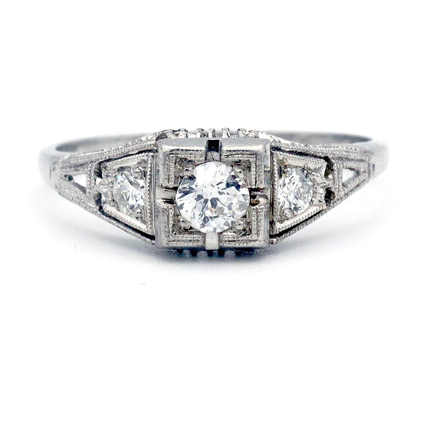 The Caitlin ring is an authentic vintage engagement ring from the Art Deco era circa 1930's. The ring features a .30 carat old mine cut diamond of F color, VS2 clarity, residing in a geometric square milgrain frame. The diamond is flanked by 2 mine cut diamond accents. Crafted in platinum, accentuated with open metal work and filigree engravings. A classic and timeless ring with intricate milgrain detailing. In excellent condition.