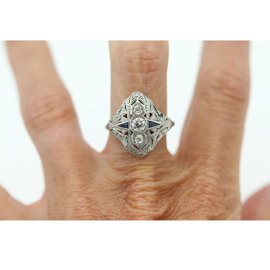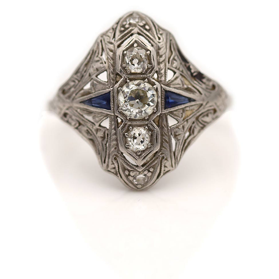 The Cobie ring is an authentic vintage engagement ring from the Art Deco era circa 1920s. The ring features a trio of gleaming mine cut diamonds weighing approximately .55 carat of H color VS2 clarity. the diamonds are flanked by 2 synthetic kite shape sapphires. Crafted in platinum (18kt ring ring shank), completed with open metal work and filigree engravings. A stunning dinner ring, perfect to wear on either hand! In very good condition.