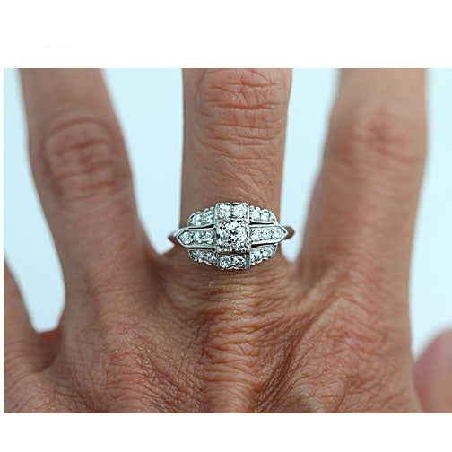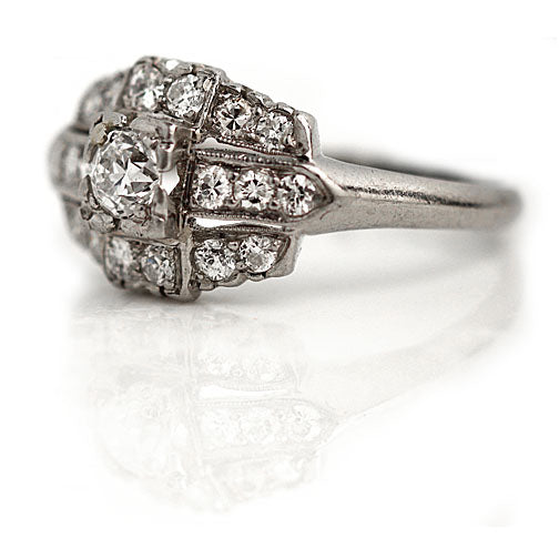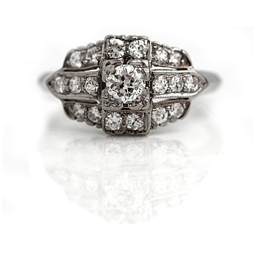 The Caitline ring is an authentic vintage diamond engagement ring from the Art Deco era circa 1940's. This ring features a .25 carat old mine cut diamond of F color, SI1 clarity. The diamond is surrounded by a delicate halo of 18 old mine cut diamond accents. Crafted in platinum, accentuated with delicate milgrain engravings. A crisp, clean vintage engagement ring. In very good condition.
