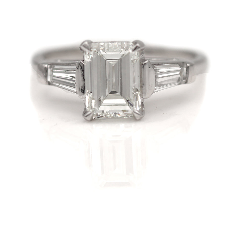 The Sallie Joe ring is an authentic vintage engagement ring, circa 1970's. The ring showcases an elegant, natural 2.00 emerald cut diamond accompanied by a GIA certificate stating J color and SI1 clarity. The diamond is flanked by two (2) large tapered baguette diamonds. Beautifully crafted in gleaming platinum. Classic and always lovely. A timeless vintage jewel. In very good condition.