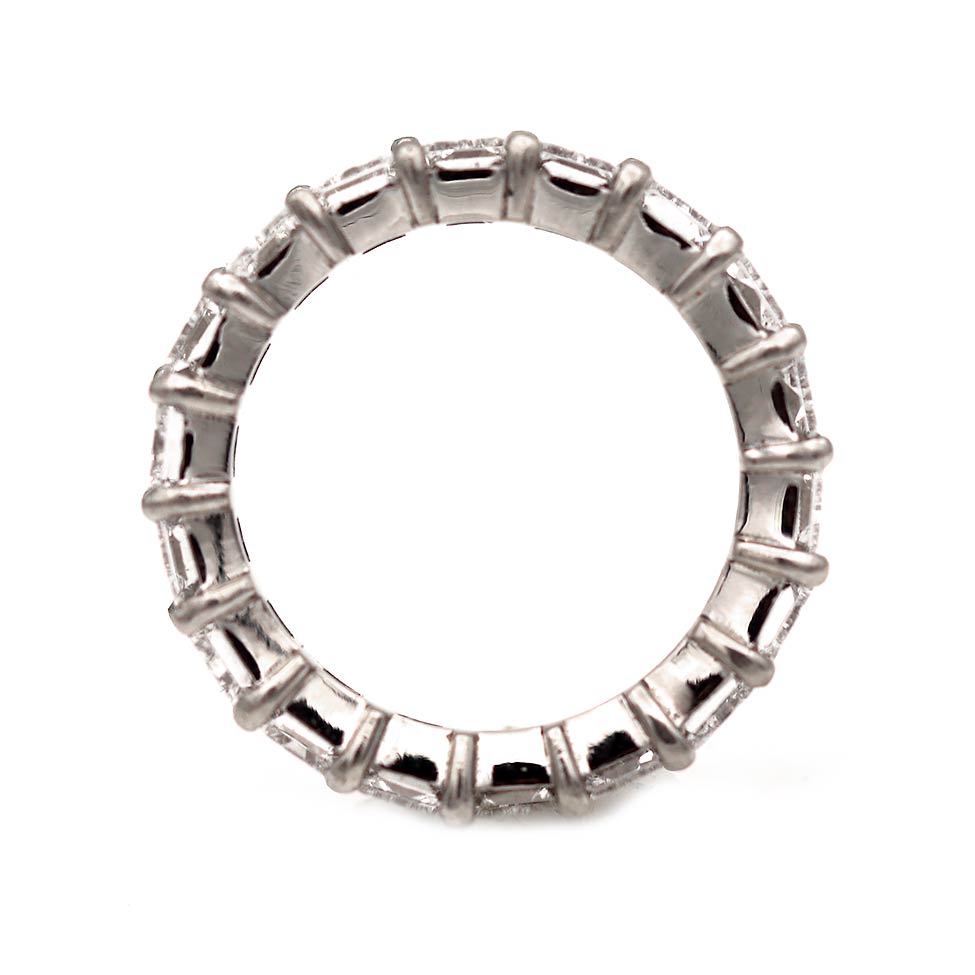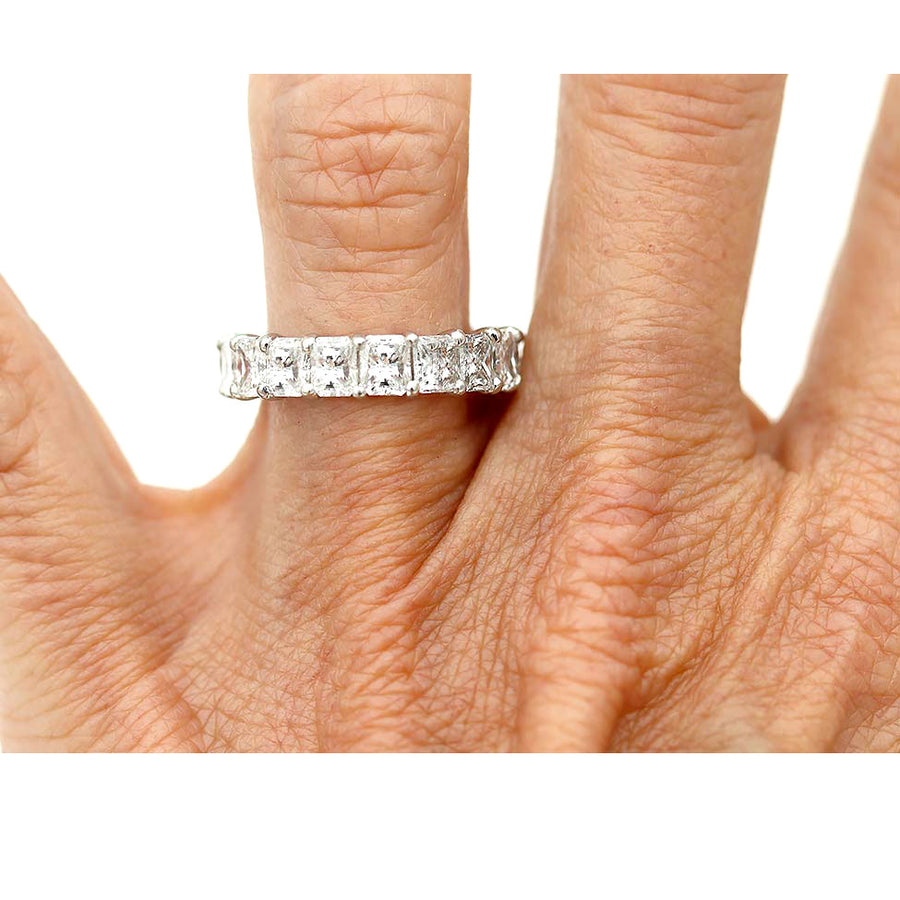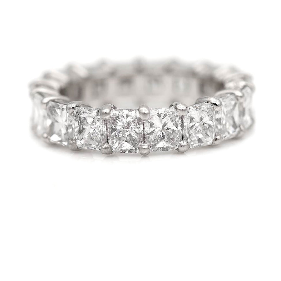 The Lee Anne wedding ring is an authentic vintage radiant cut eternity ring, circa 1990's. This eternity ring features 18 bright white, prong set, radiant cut diamonds of F color and SI1 clarity, weighing approximately 4.50 carats (.25 points per diamond). Beautifully crafted in platinum, this is a timeless wedding ring. Perfect to stack or wear solo. Takes 2 weeks to make. All sizes.