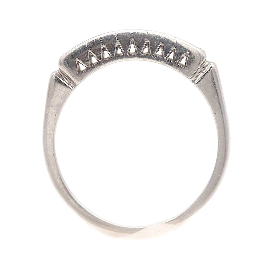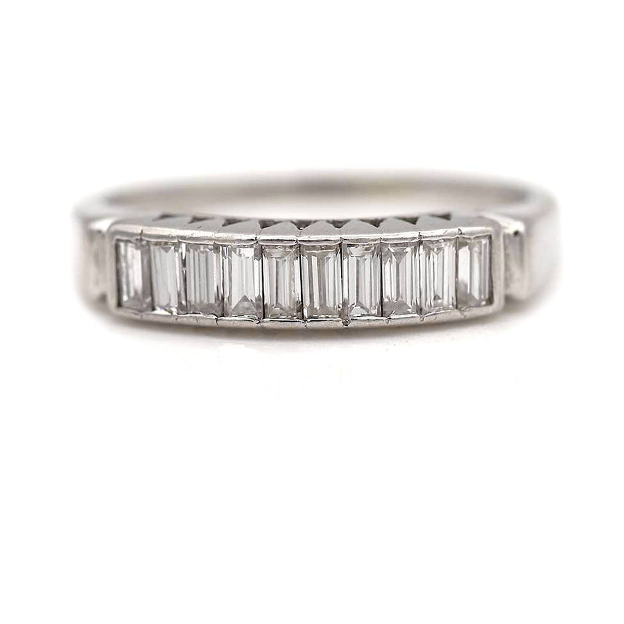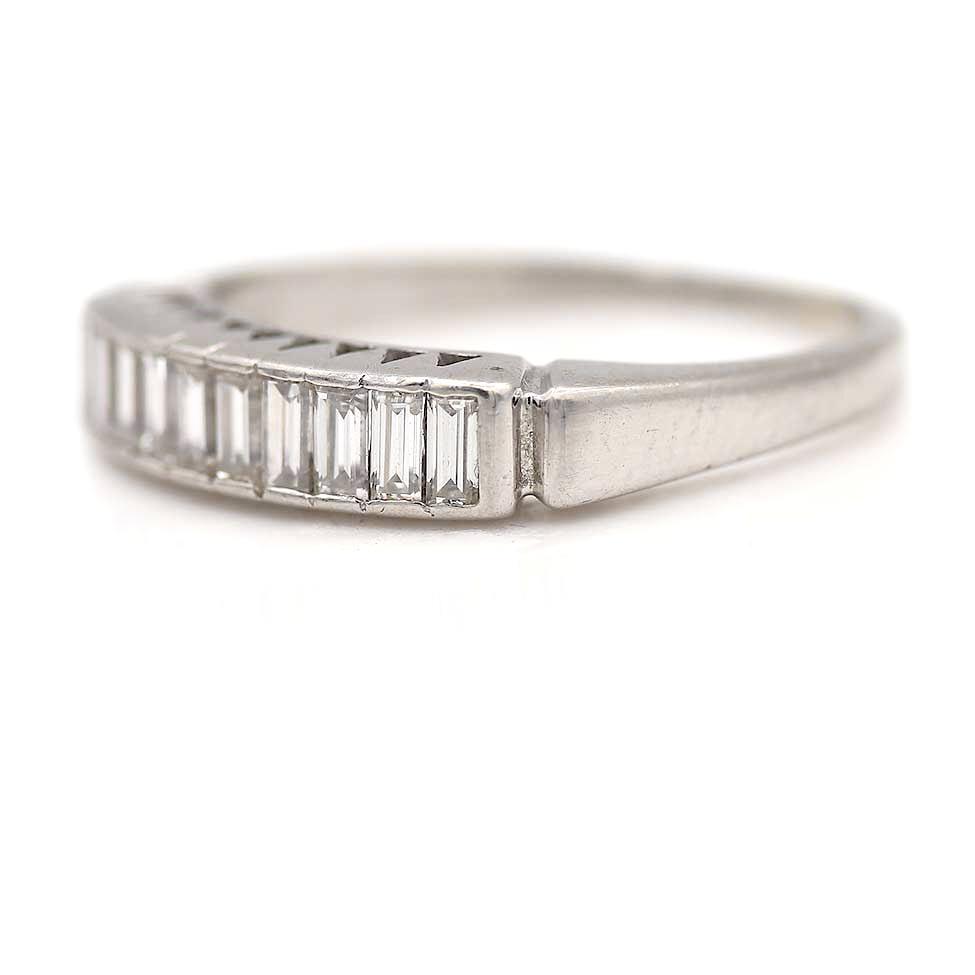 The Ingram band is an original vintage wedding band, circa 1970's.  This band features ten (10) vintage straight baguette cut diamonds, weighing approximately .50 carat with H color and VS2 clarity. Beautifully crafted in platinum, this band is perfect to wear on either hand or even stack with your favorite vintage wedding bands.  In very good condition.