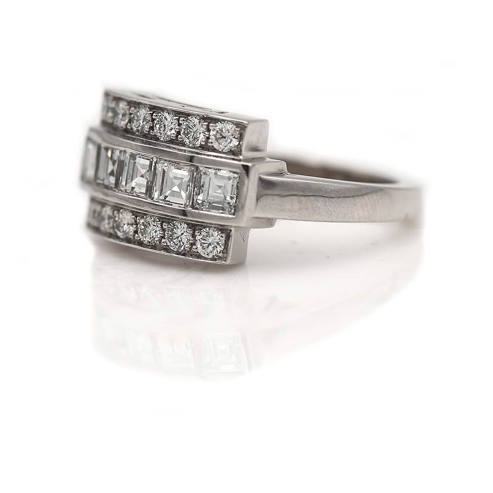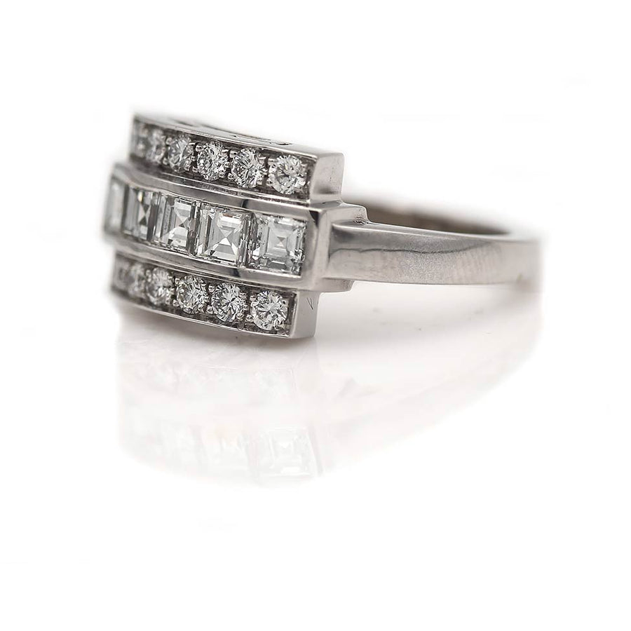 The Emmela ring is a stunning VDR.com made vintage style wedding ring. This ring features 5 authentic vintage 1970's bezel set square cut diamonds surrounded by 12 round cut diamonds. Beautifully crafted in recycled gleaming platinum, this is an exact replica of an original vintage wedding ring we once owned. Made with love in NYC.