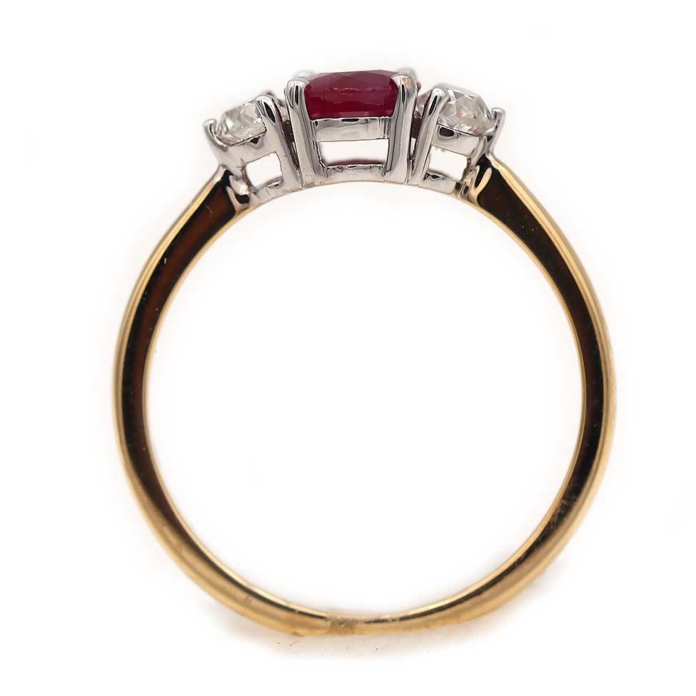 The Alexir ring is a VintageDiamondRing.com made Vintage style engagement ring. This ring features an authentic 1970's .57 carat AGI certified natural round cut Burma ruby, flanked by two (2) old mine cut diamond accents weighing .40 carat. Beautifully crafted in recycled platinum and 18 kt two tone gold. A classic gemstone ring. Accompanied with an AGI report stating "Moderate Gemological Evidence of Heat - Burma Origin."