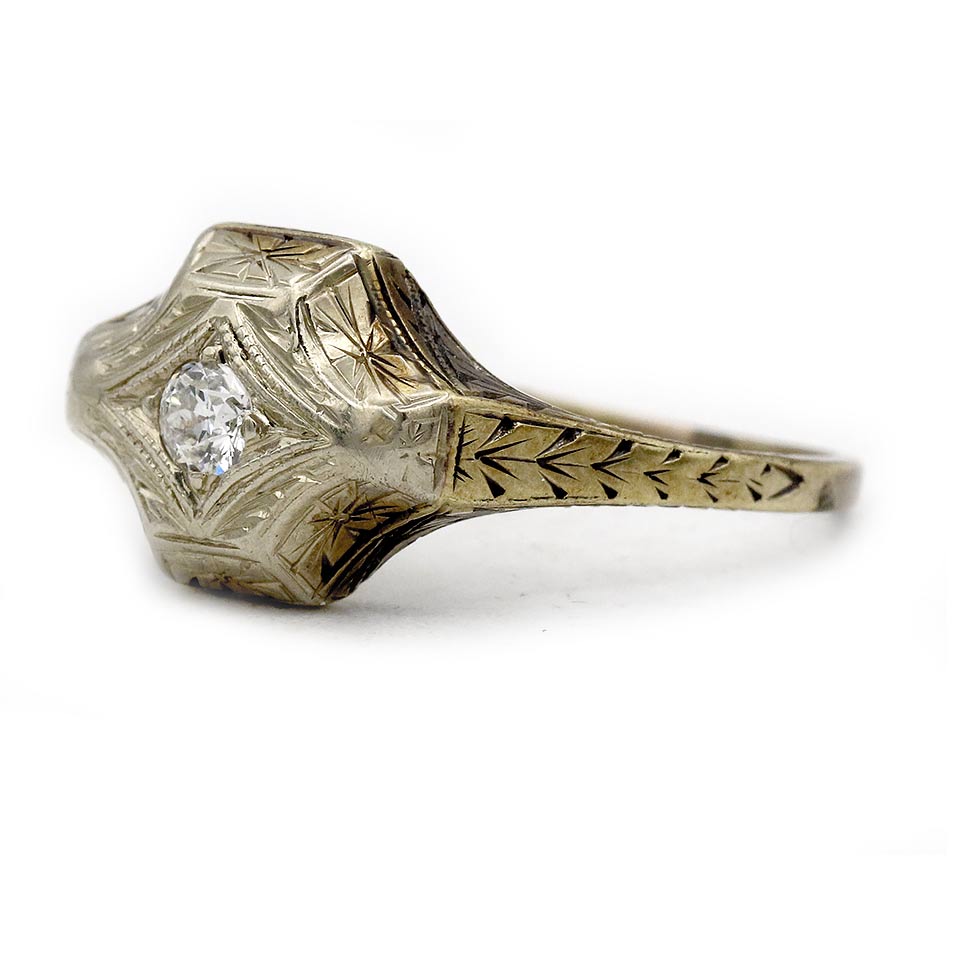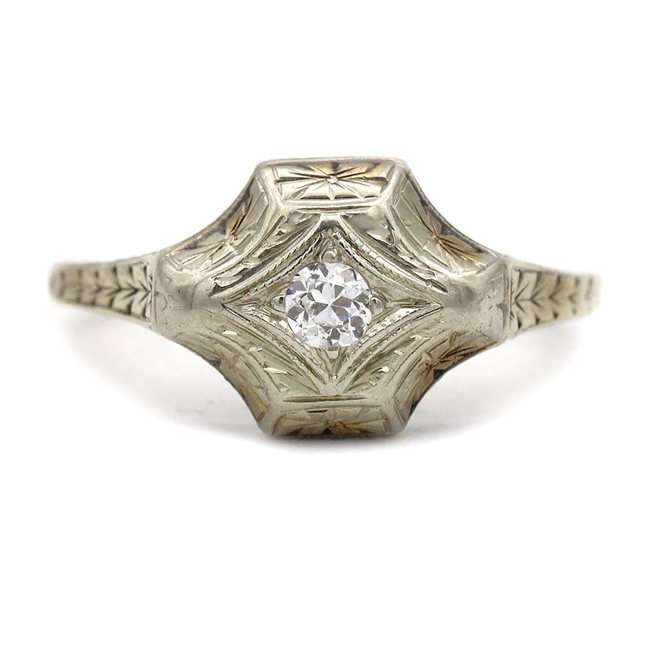 The Lilly ring is an authentic vintage engagement ring from the Art Deco era ring circa 1930's. The ring features a dazzling .15 carat old European cut diamond of F color, VS2 clarity residing in a geometric 4-sided frame. Crafted in 14 karat white gold, accentuated with intricate filigree engravings. An exquisite Art Deco piece, in very good condition.