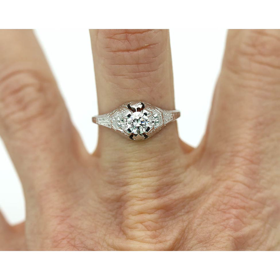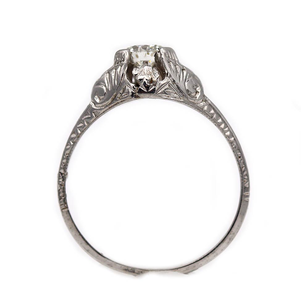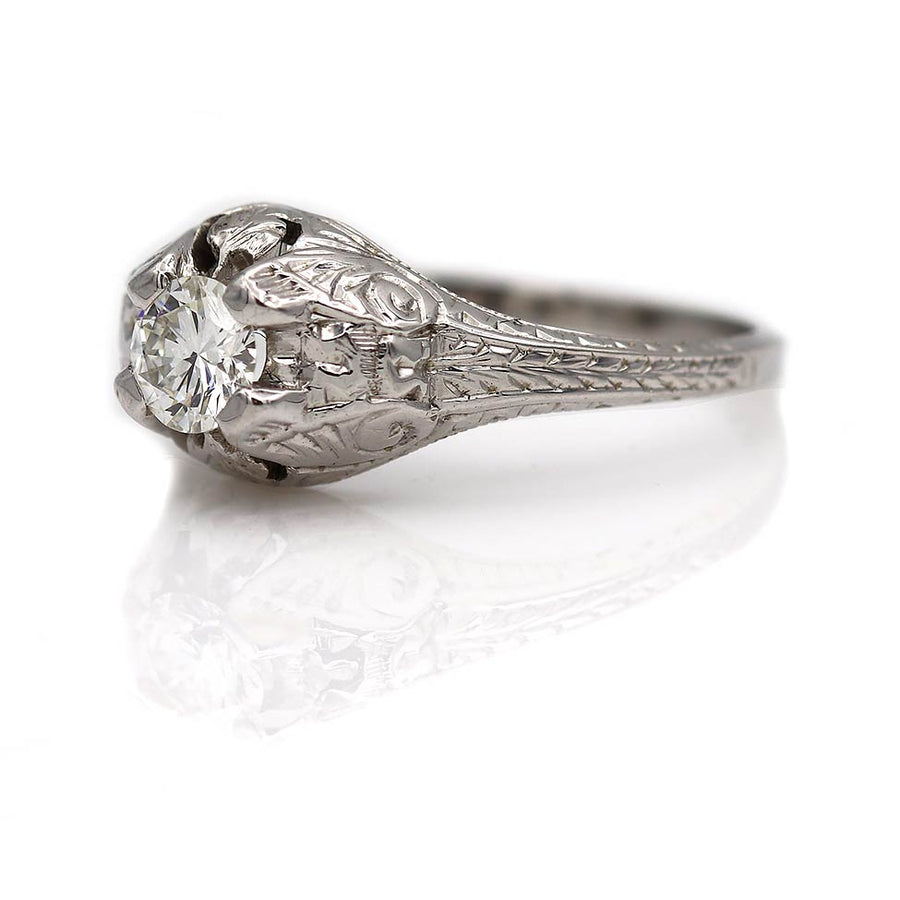 The Hendra ring is an authentic vintage engagement ring from the Art Deco era circa 1940s. The ring features a .35 carat transitional cut diamond of F color, VS2 clarity, set with knife edge prongs. Beautifully handcrafted in 18 karat white gold, accentuated with swirling metal work and intricate filigree engravings. A delicate vintage treasure. In very good condition. They don't come any finer.