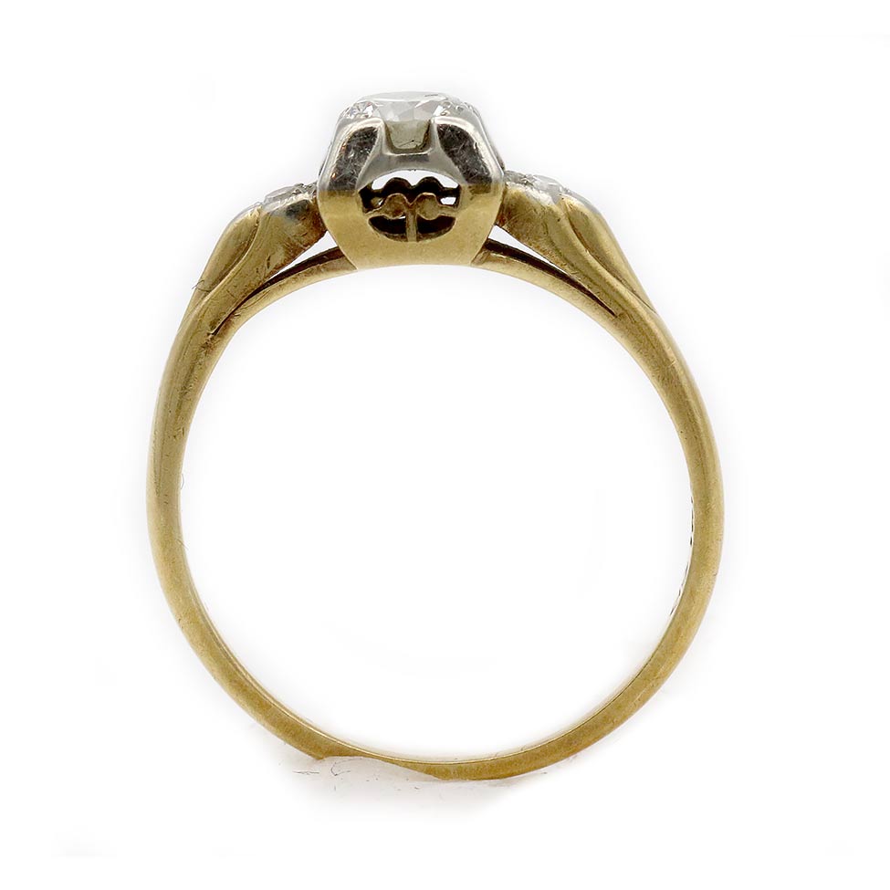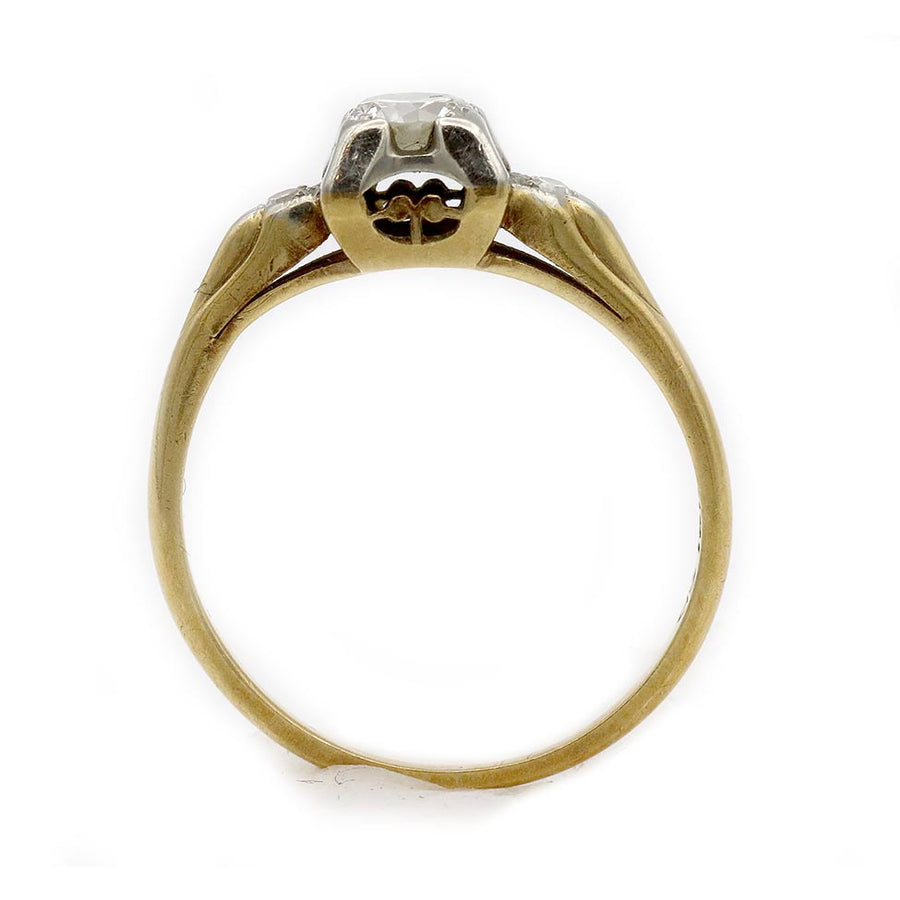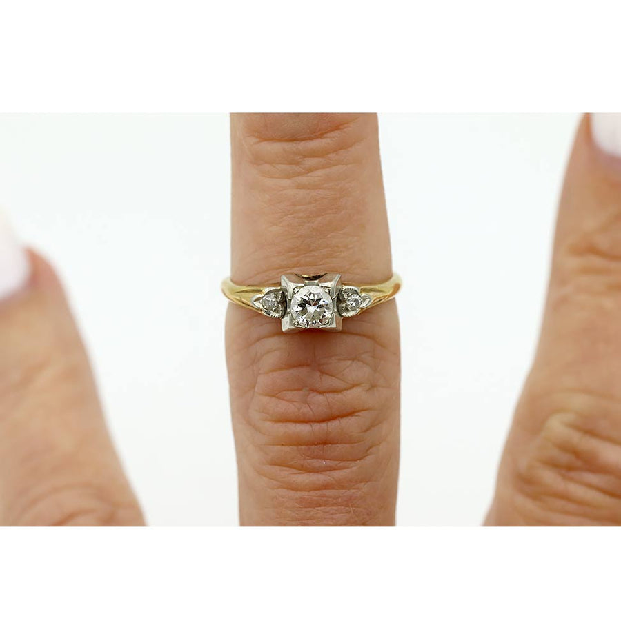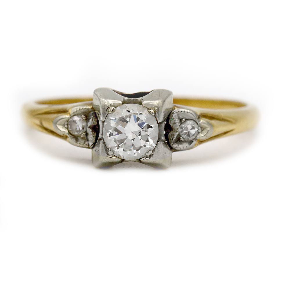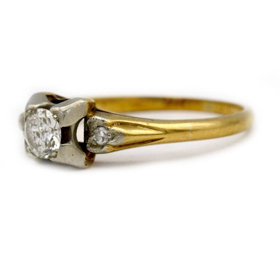 The Vivanne ring is an authentic vintage diamond engagement ring circa 1940's. The ring boasts a glittering .30 carat old European cut diamond of H color, VS2 clarity. The diamond is flanked by 2 milgrained framed single cut diamond accents. Crafted in 18 karat two tone gold, white gold atop yellow gold ring, accentuated with a fluted shank. A consummate three stone ring, featuring 3 glittering vintage diamonds. In very good condition.