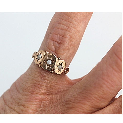 The Minah T ring is an authentic vintage engagement ring from the Victorian era circa 1900s. The ring features 3 vintage seed pearls. Beautifully crafted in 10 karat rose gold setting, accentuated with swirls of open metal work and intricate sunburst engravings. A timeless vintage ring, in very good condition.