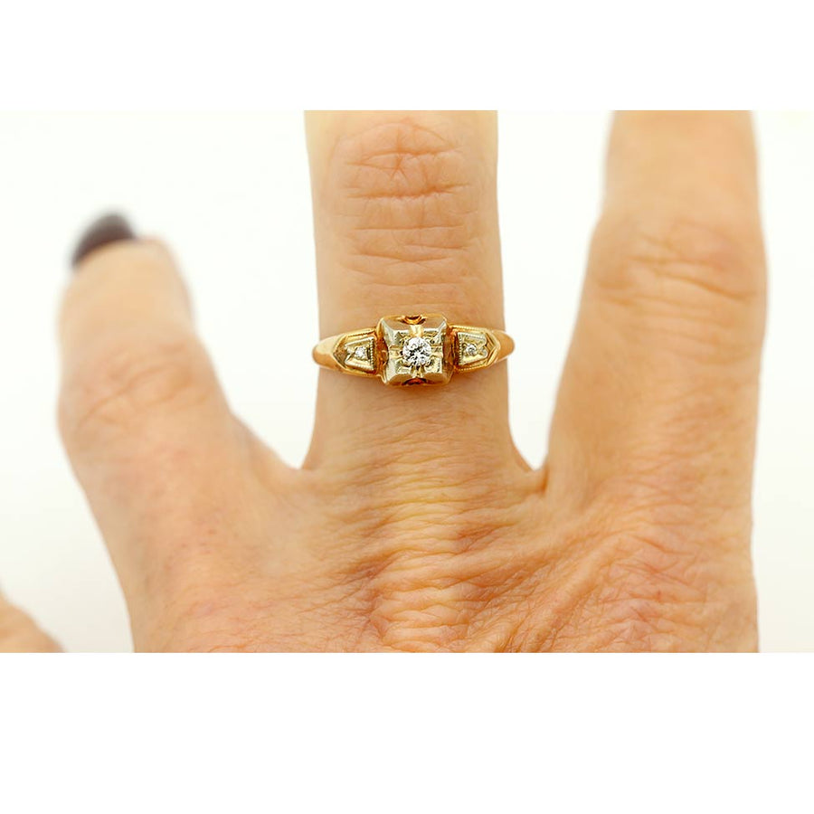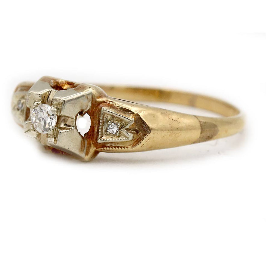 The Chance ring is an authentic vintage diamond engagement ring circa 1940's. The ring features a bright-white .10 carat old European cut diamond, of G color, VS2 clarity. The diamond is flanked by two single cut diamond accents. Crafted in 14 karat white gold atop a gleaming 14 karat yellow gold ring, completed with delicate milgrain engravings. A sweet vintage ring, in very good condition.