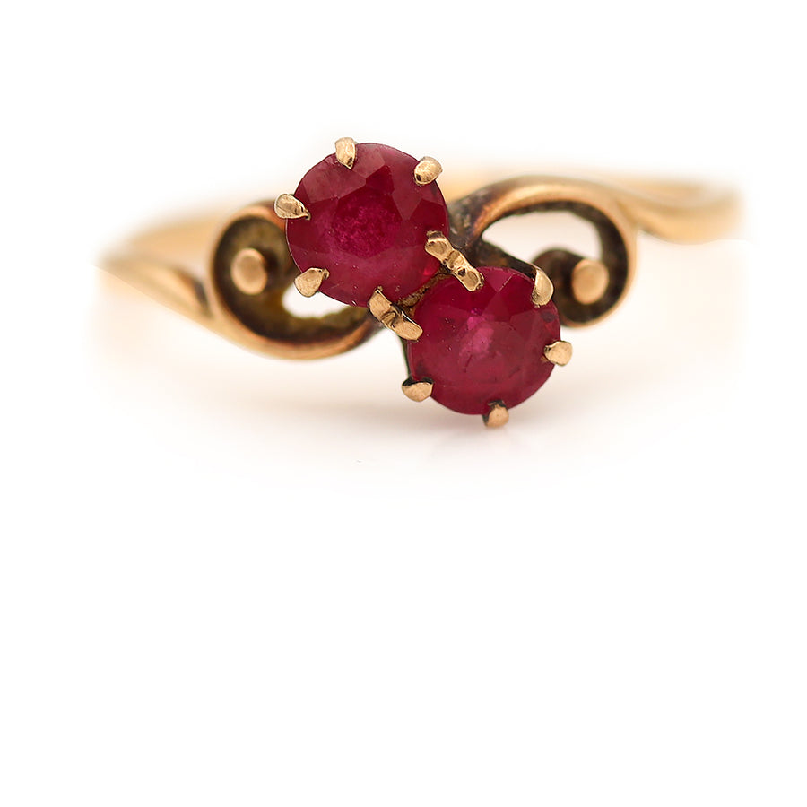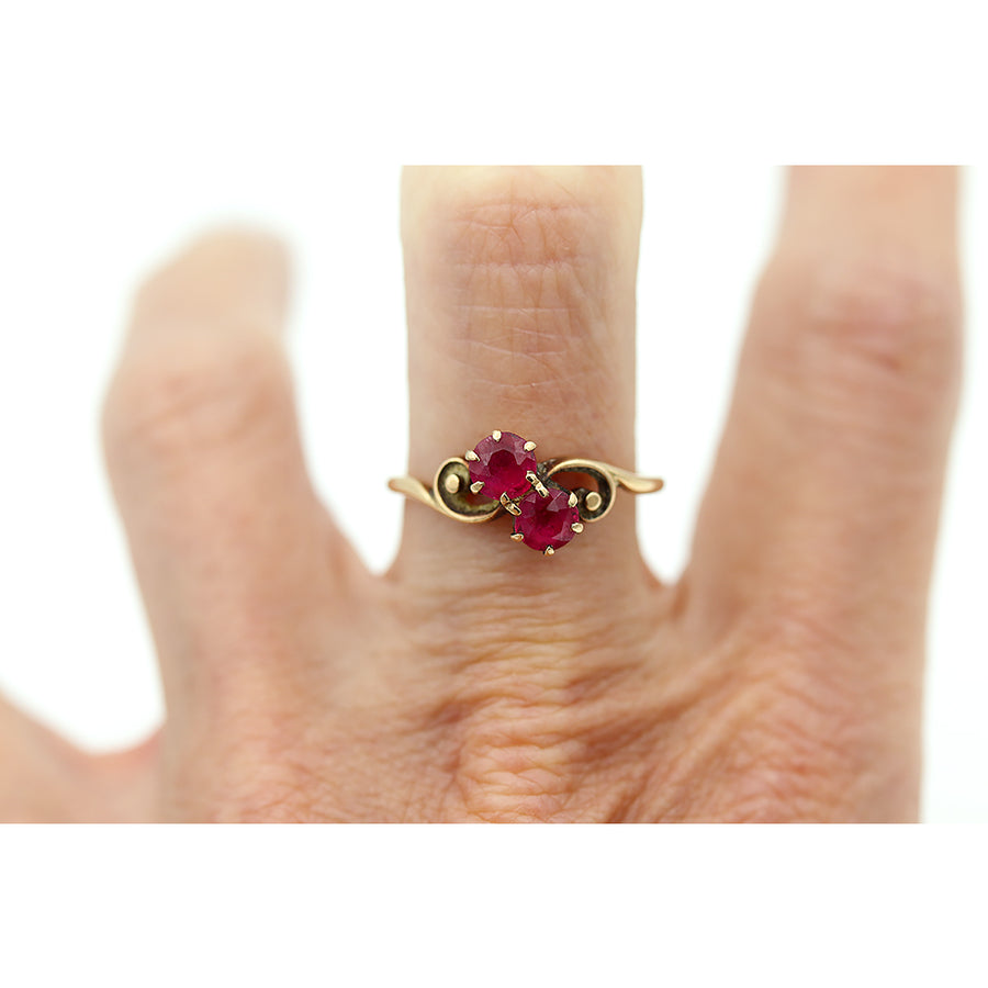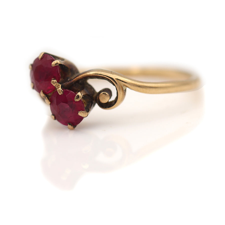 The North Country ring is an authentic antique engagement ring from the Victorian era circa 1900s. This sweet ring boasts two (2) synthetic round cut rubies, weighing .70 ctw, beautifully set within 14 kt rosy-yellow gold. Perfect to wear on either hand. As sweet as can be, in good condition.