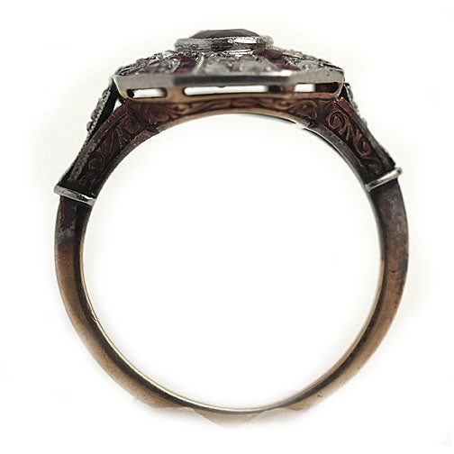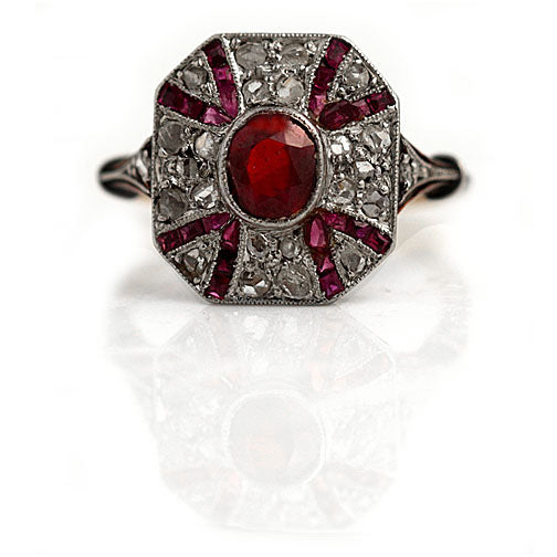 The Lila G is an authentic Art Nouveau engagement ring circa early 1900's. The ring features a bezel set .65 carat synthetic oval cut ruby, flanked by a delicate halo of 22 rose cut diamonds and 24 natural square cut pigeon blood Burmese rubies. Beautifully handcrafted in the early 1900's in silver and 18 karat yellow gold, completed with delicate milgrain and filigree engravings. A beautiful antique jewel, in very good condition.